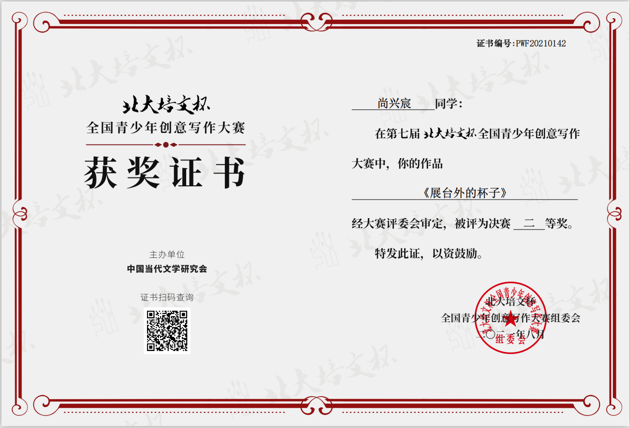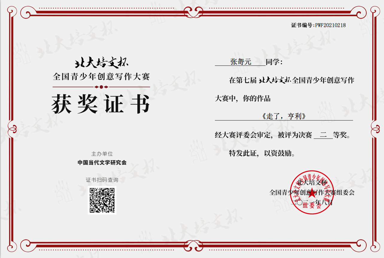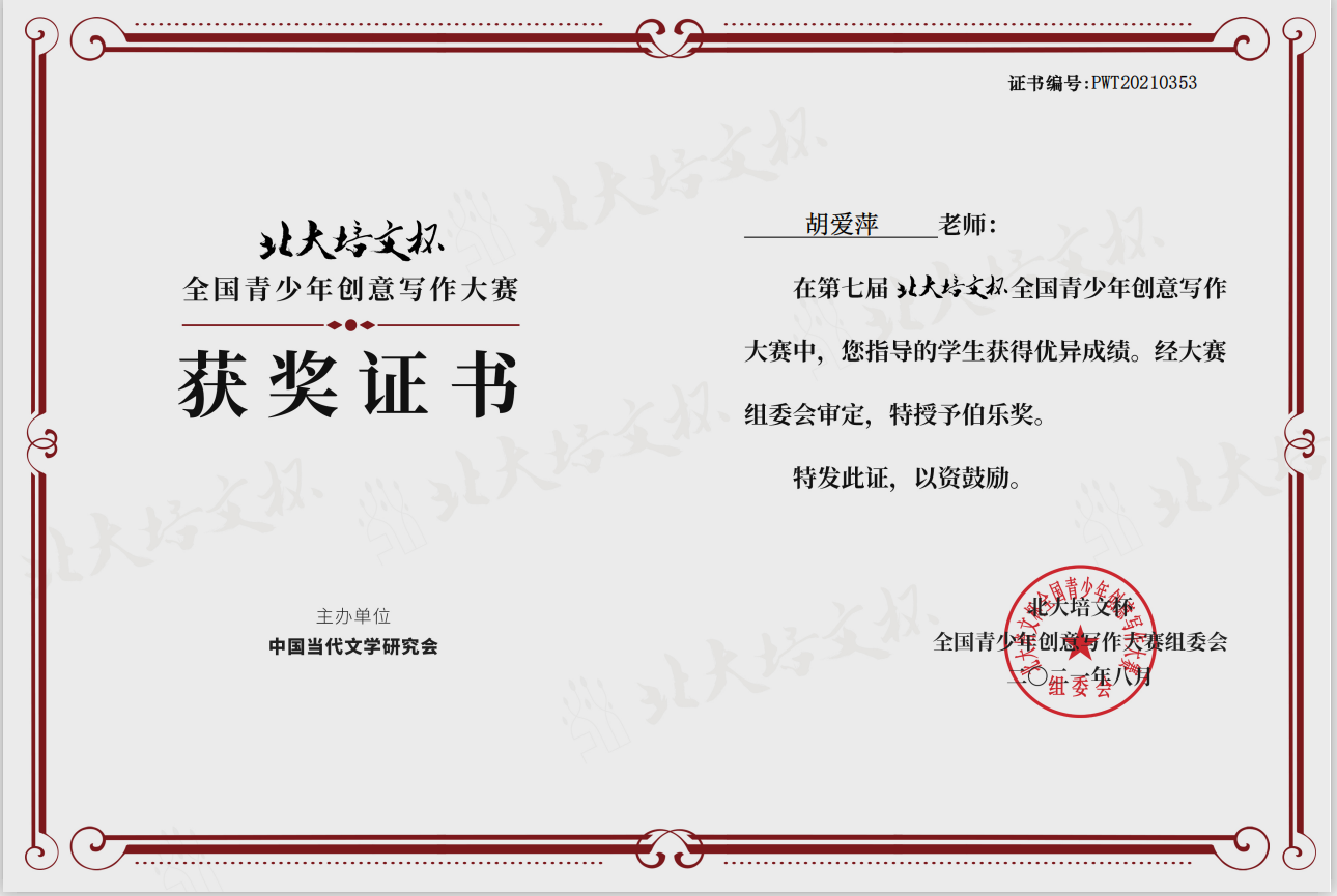 我校学子在第七届北大培文杯全国青少年创意写作大赛决赛中成绩优异。2019级10班张哿元、尚兴宸,2019级12班张润泽,2019级14班伍湘齐,2019级16班赵龙宇等五名同学获决赛二等奖。董莉、吕宏佳 、孙成霞、胡爱萍老师获培文杯伯乐奖。