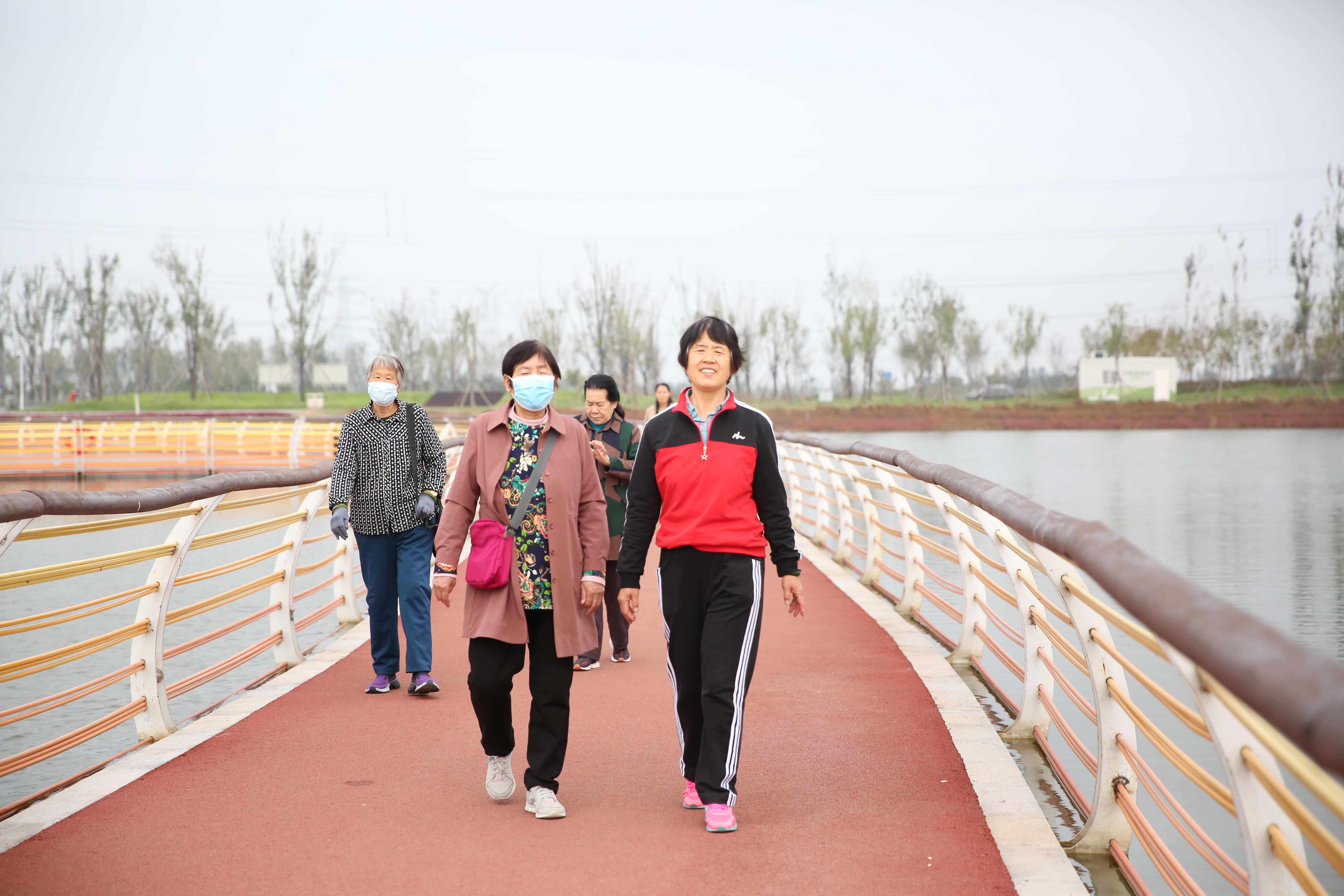 龙悦湖湿地彩虹桥俯瞰像一朵巨大的莲花,盛开在水上,深受游客喜爱,被称为网红桥,节假日常有不少人来此观光打卡。这天上午,老教师们精神饱满,兴致勃勃,漫步在彩虹桥上,呼吸着新鲜的空气,看各种珍禽鸟类或在水中嬉戏,或自由翱翔,体验人与自然的亲密接触,感受东营日新月异的发展。天鹅湖蓄滞洪湿地,白芦花轻扬,“红地毯”漫铺,呈现出黄河口独特的自然环境。老教师们拿出相机,或拍摄风景,或合影留念,他们边欣赏美景,边叙同事情,为市一中、为东营市快速的发展而高兴,留下了一片片欢声笑语和一张张“更比夕阳红”的笑脸。