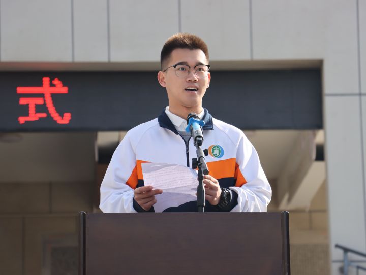 高二27班张皓天作为学生代表在发言中表示,将着眼当下,把行动落实到学习生活的细微处,锤炼过硬本领,将来积极投身于祖国的事业中去,以一片赤诚和辛勤汗水回报社会的关爱。
