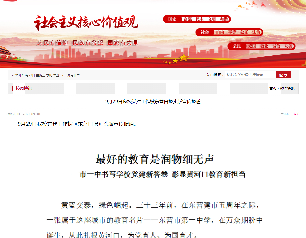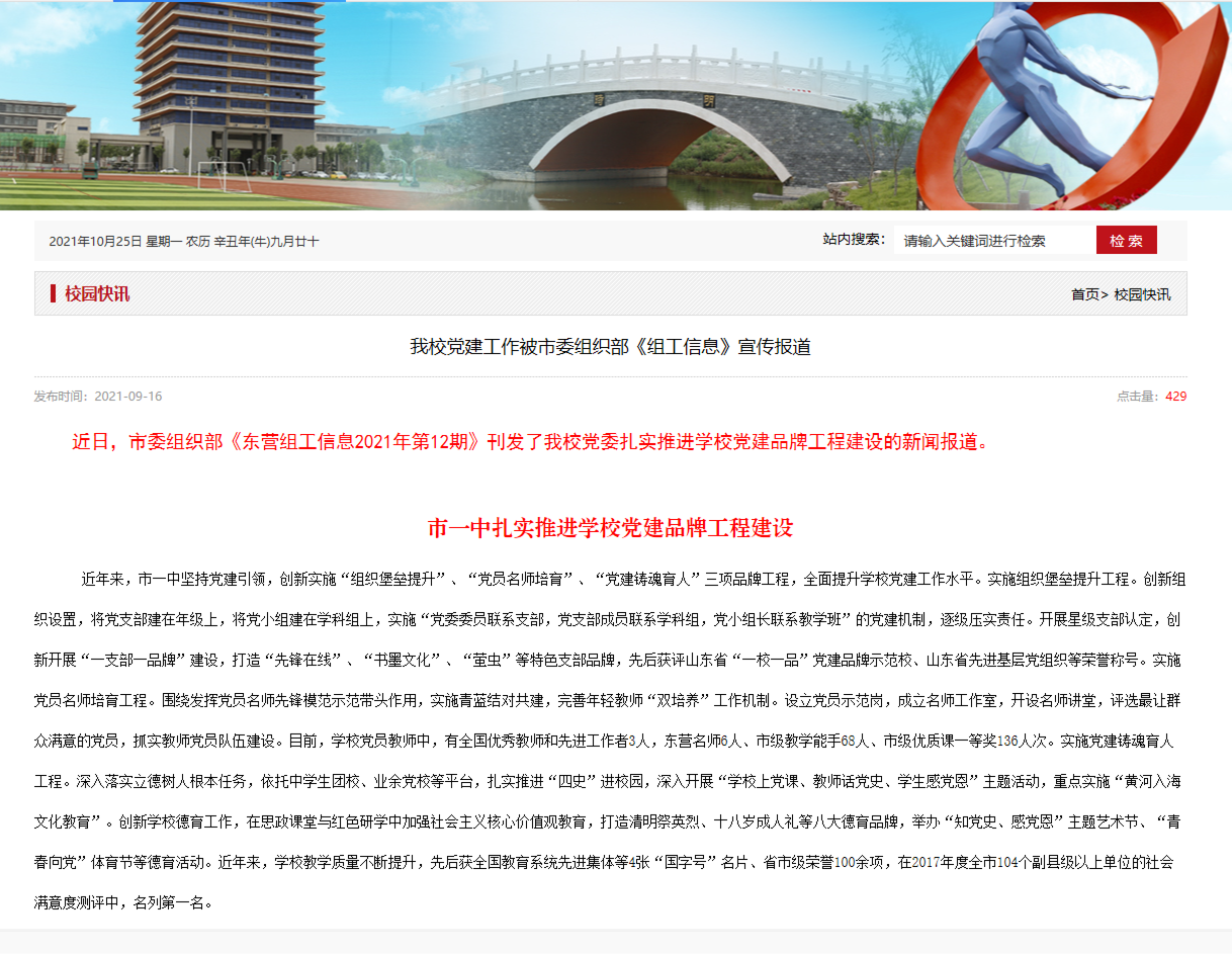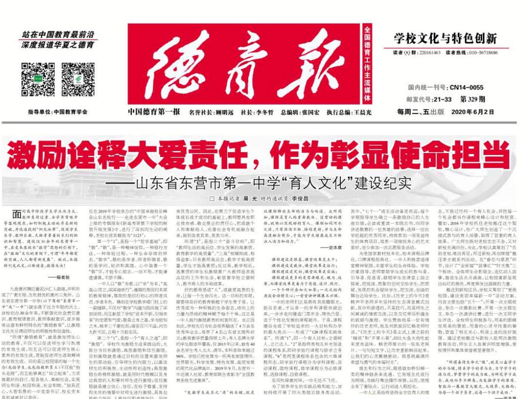 7、学校党建工作被《东营组工》、《东营日报》《黄三角早报》等市级媒体宣传,育人成果被《德育报》等国家级期刊报道。