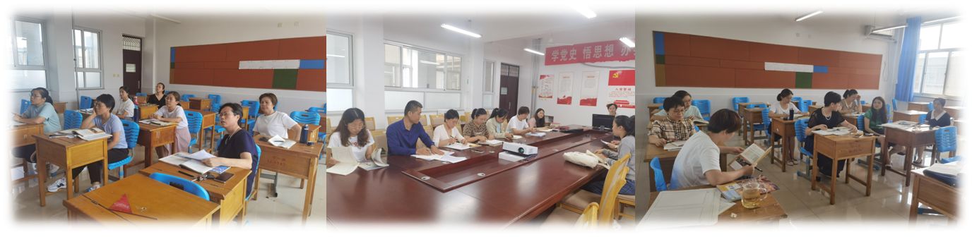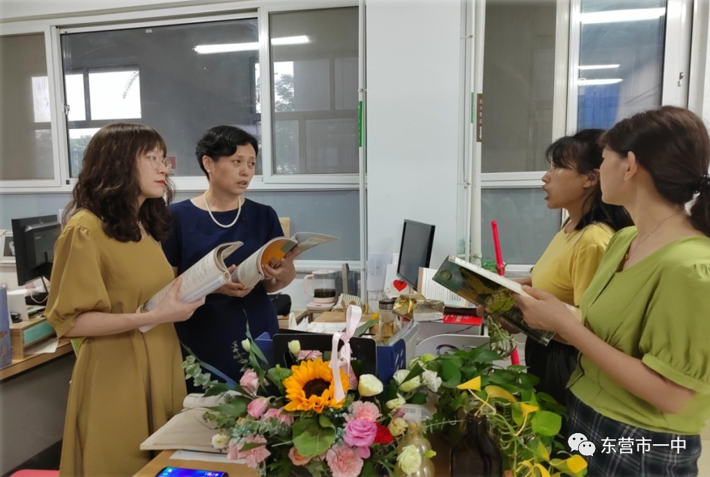 教研组长尹国红和高三英语组组长安丽华同两位参赛老师认真研读教材,讨论备课思路。