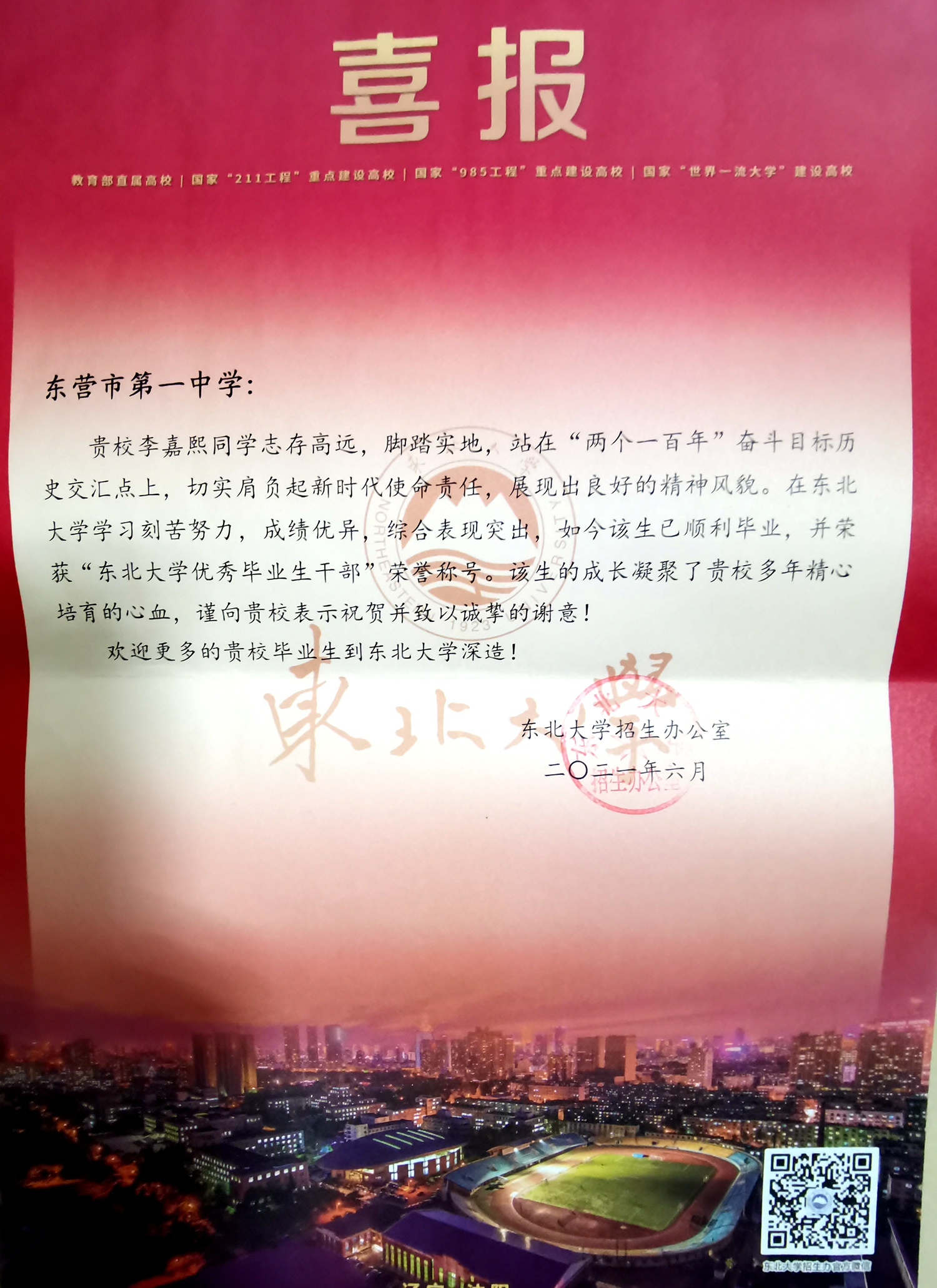 东北大学喜报