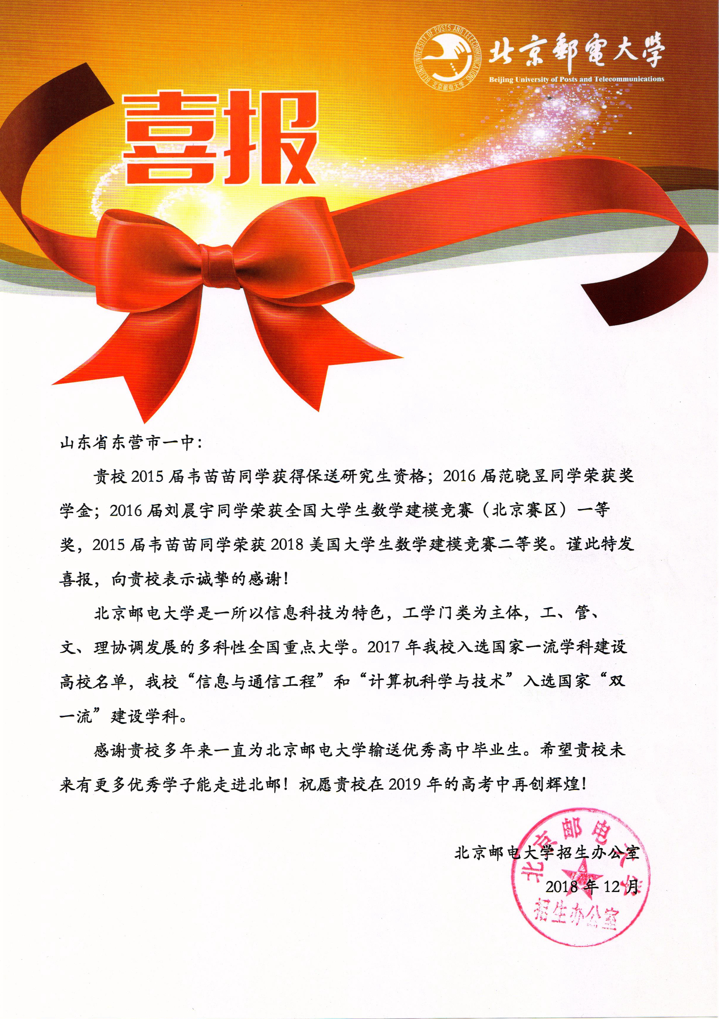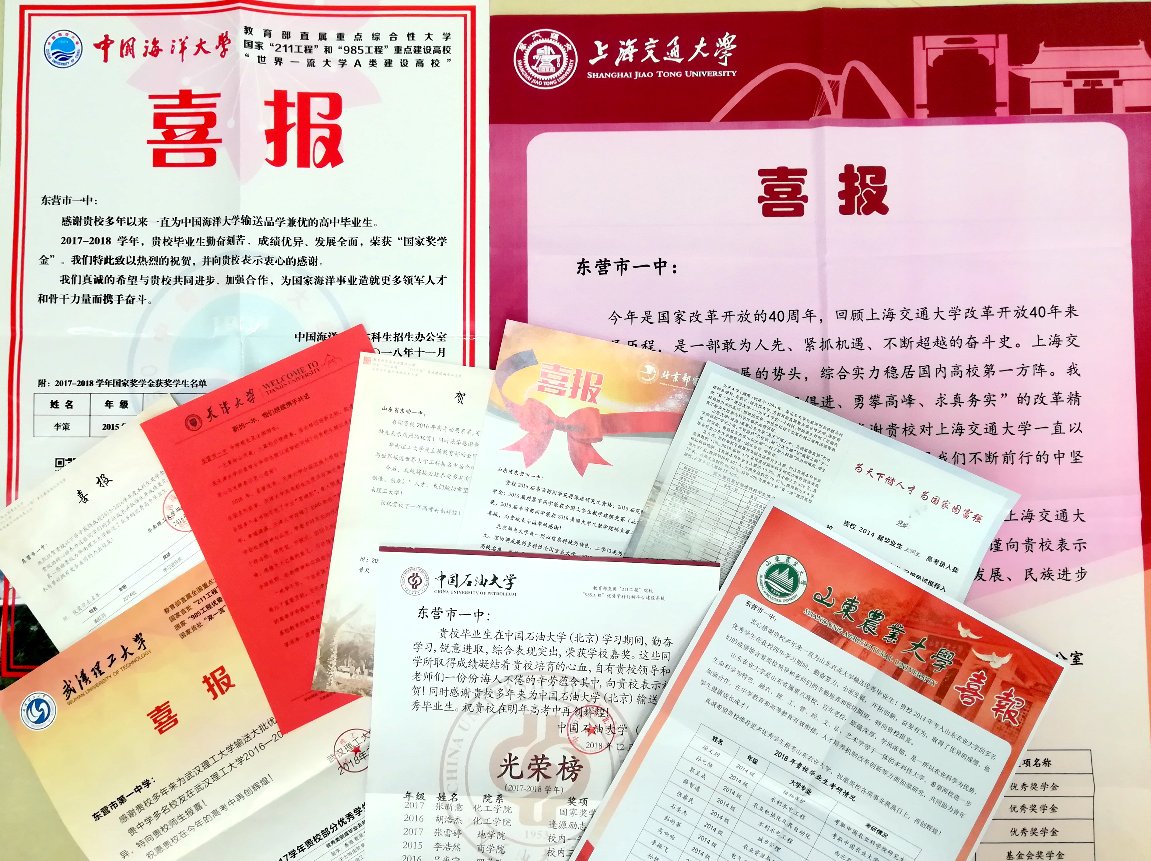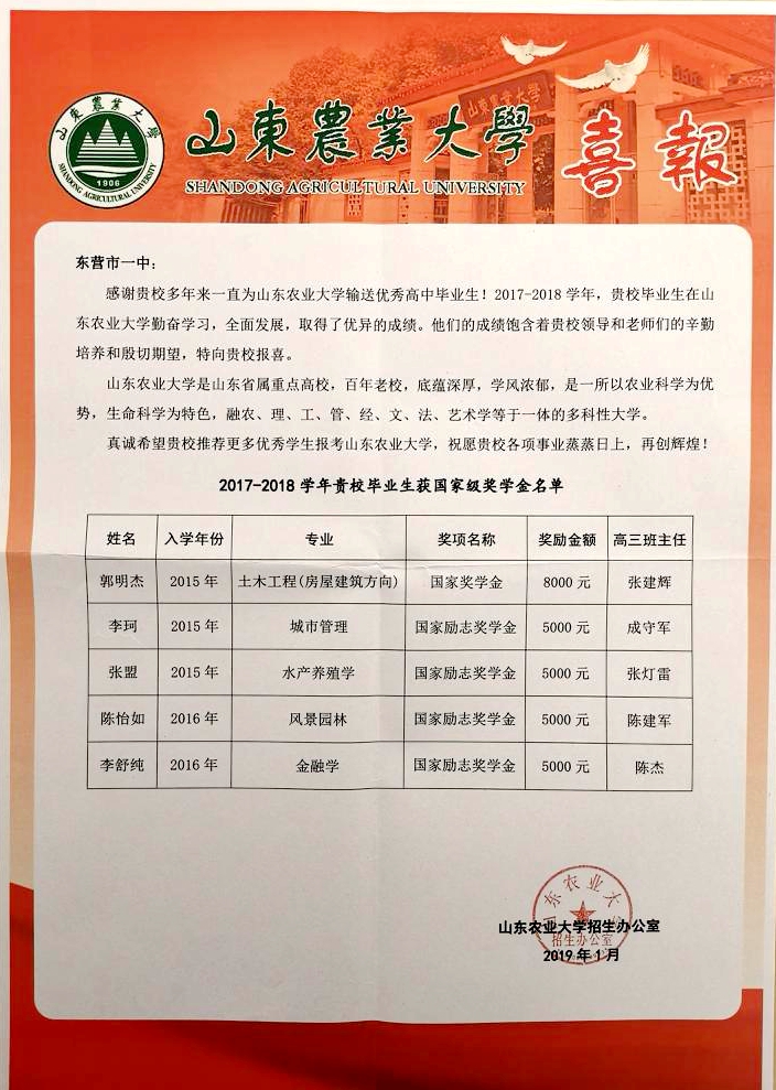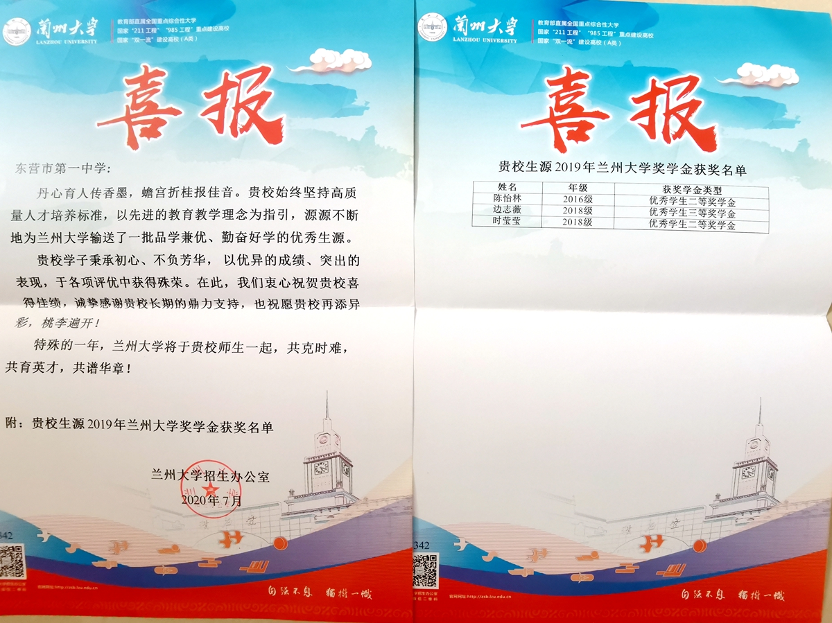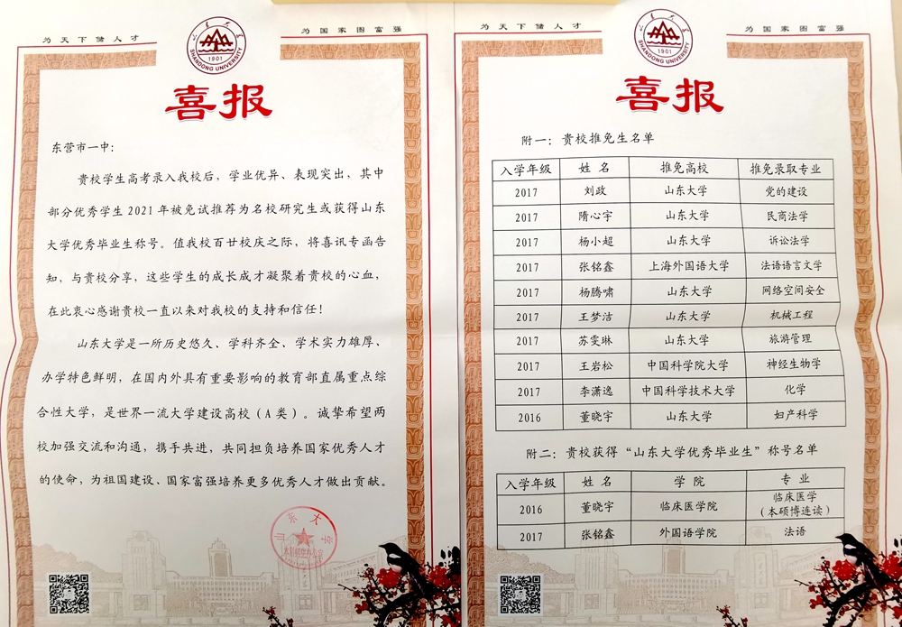 本学期,复旦大学、上海交通大学、中国人民大学、西安交通大学、中国科学技术大学等众多高校先后向东营市一中发来喜报,祝贺市一中学子在大学取得优异成绩,祝愿东营市一中再创辉煌!