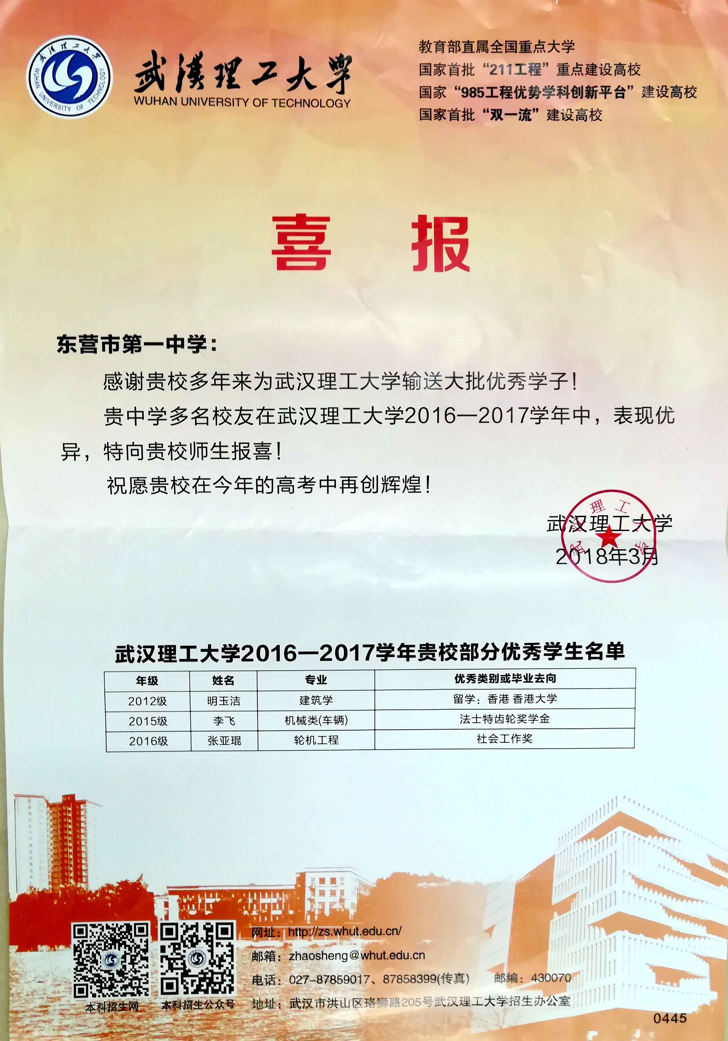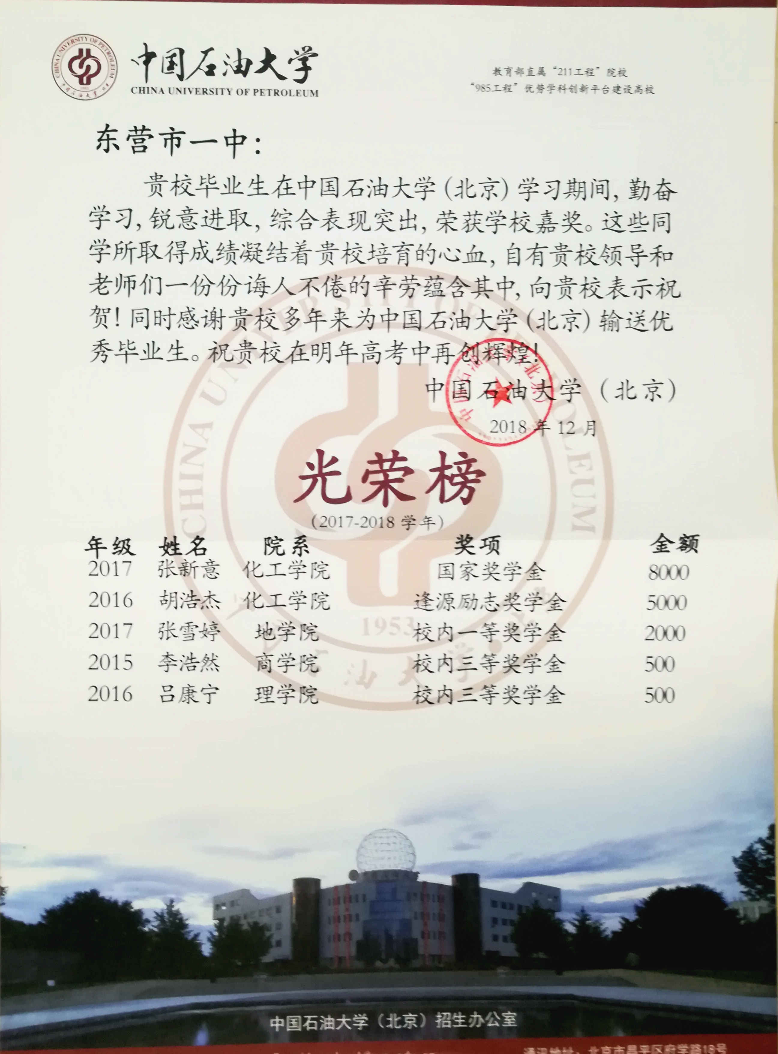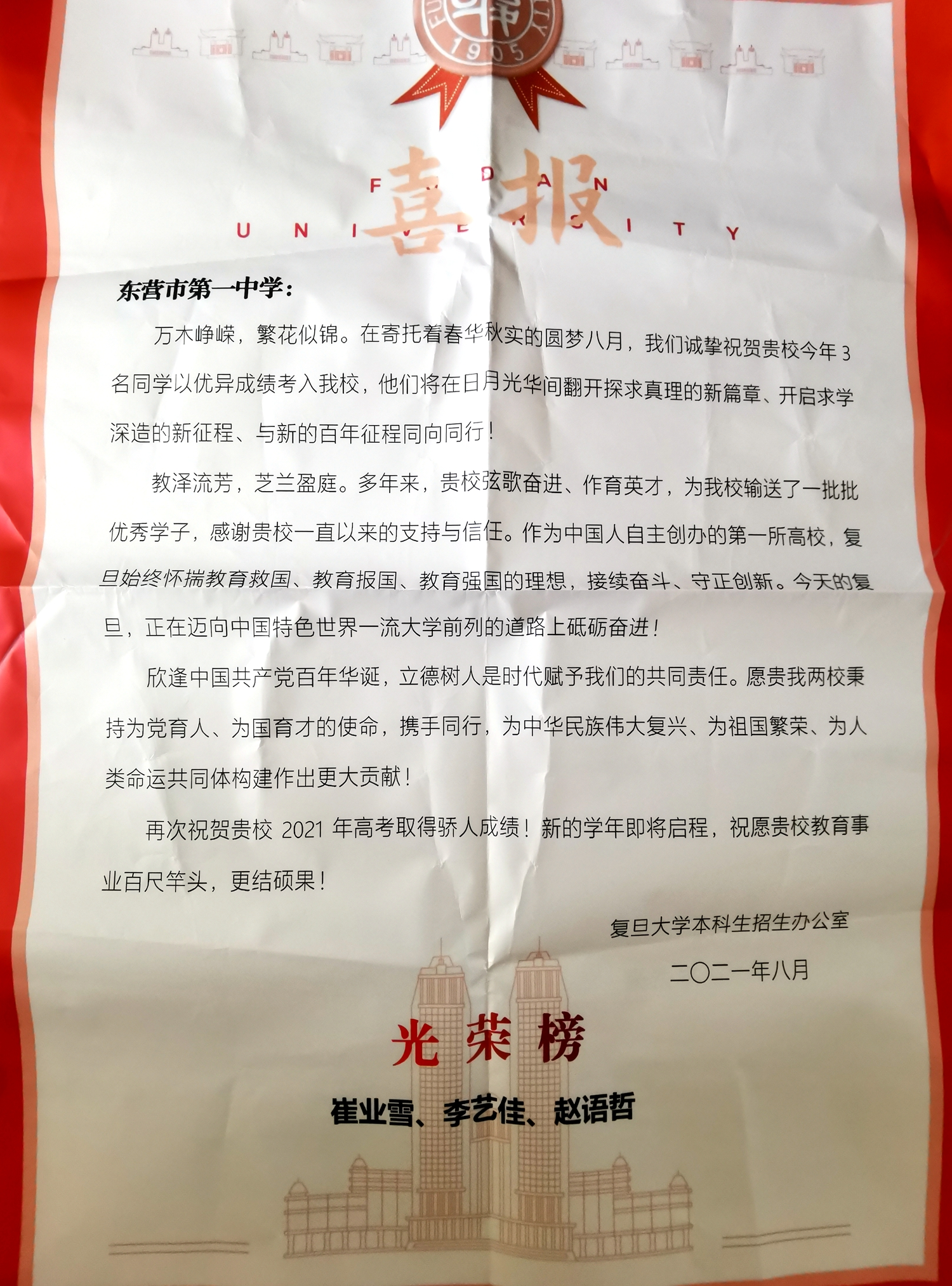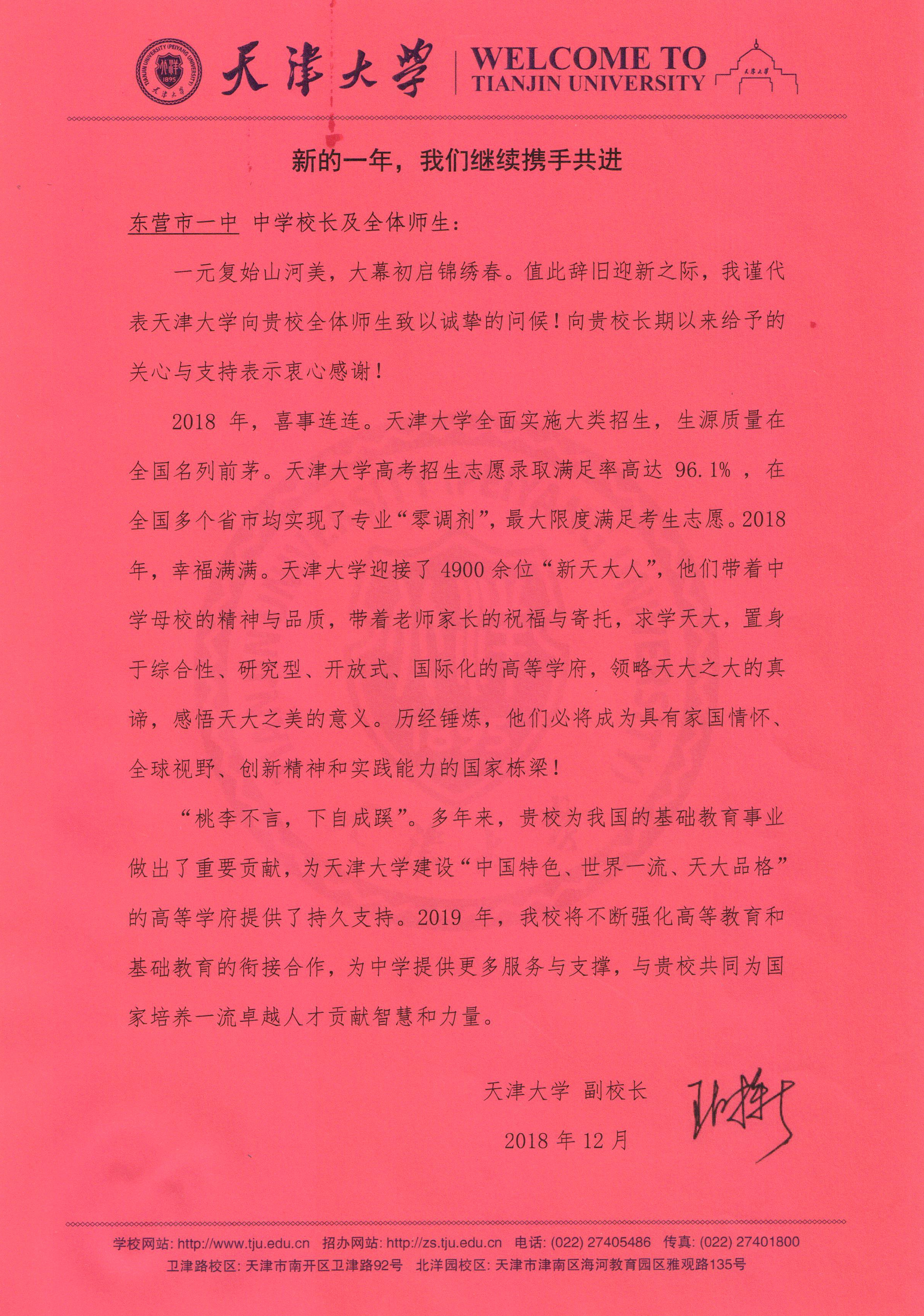 本学期,复旦大学、上海交通大学、中国人民大学、西安交通大学、中国科学技术大学等众多高校先后向东营市一中发来喜报,祝贺市一中学子在大学取得优异成绩,祝愿东营市一中再创辉煌!