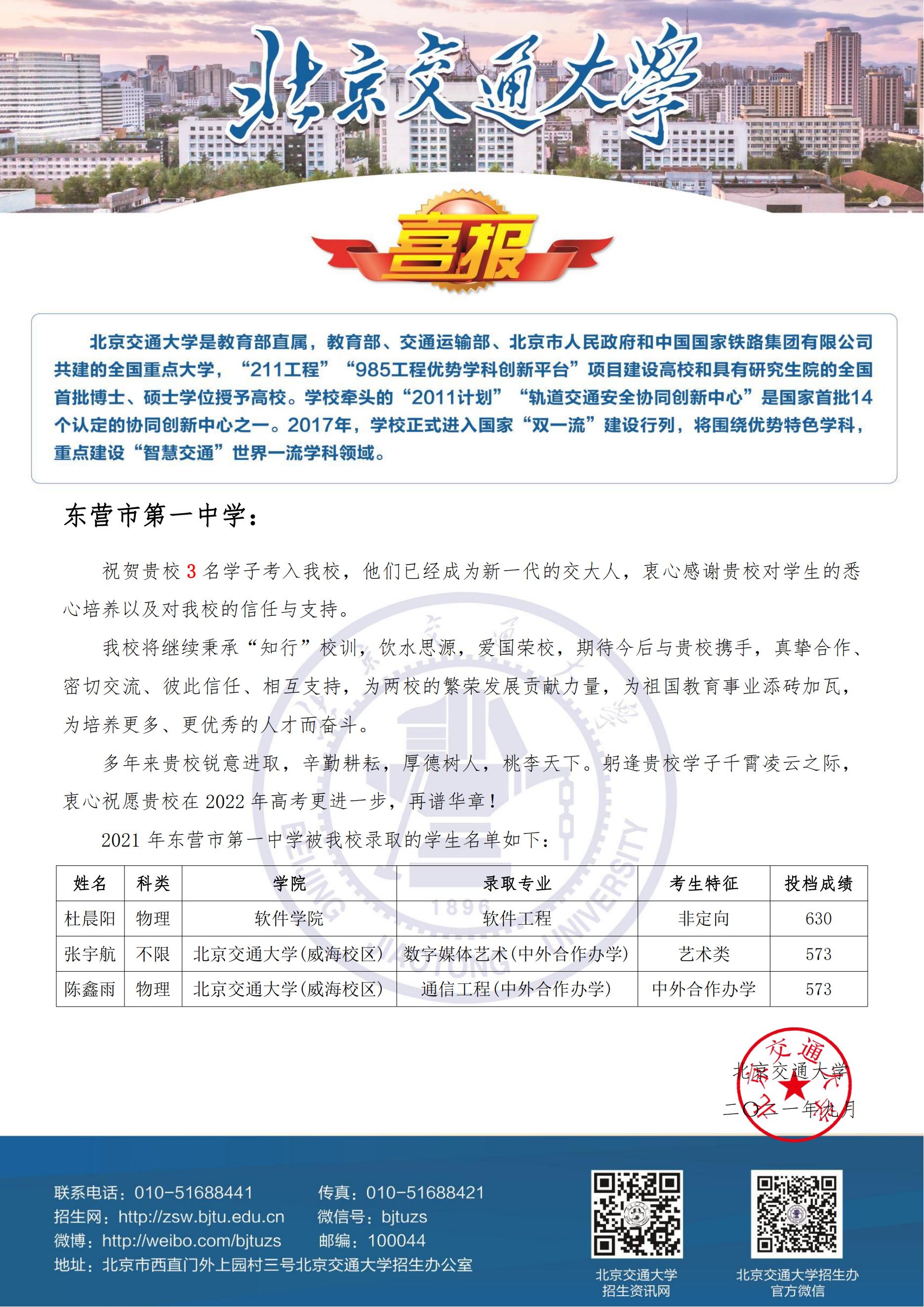 北京交通大学喜报