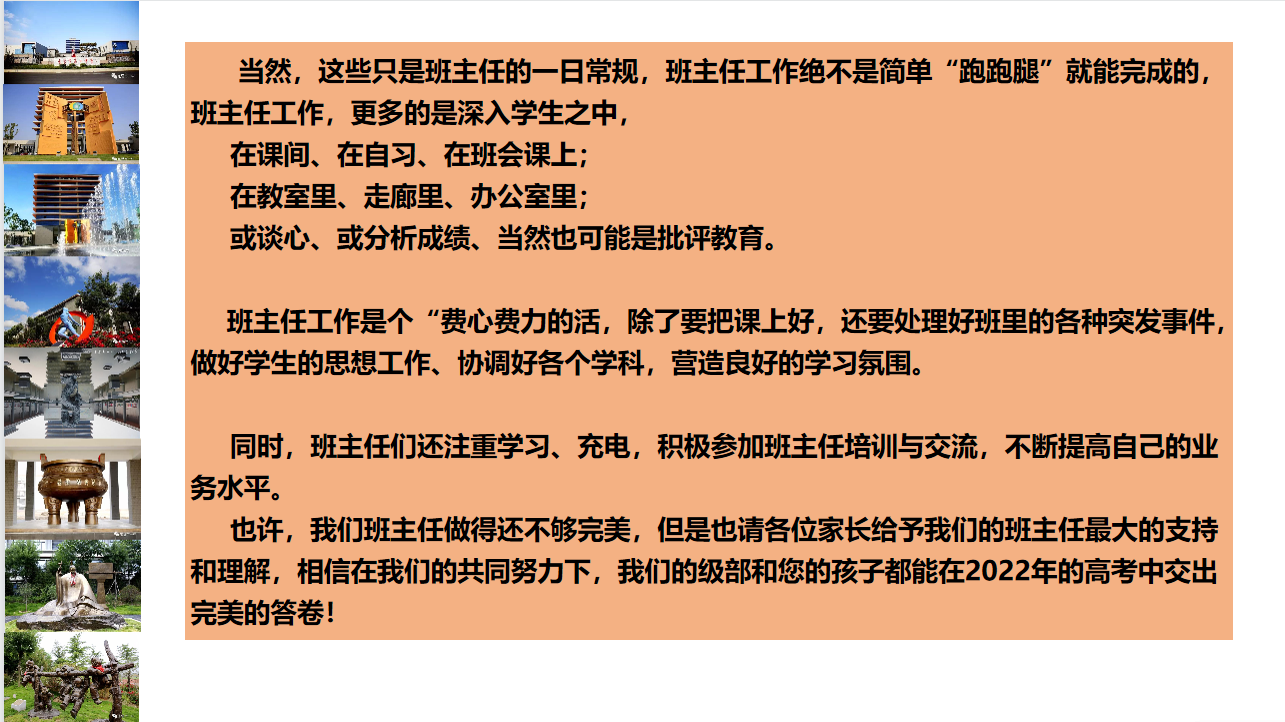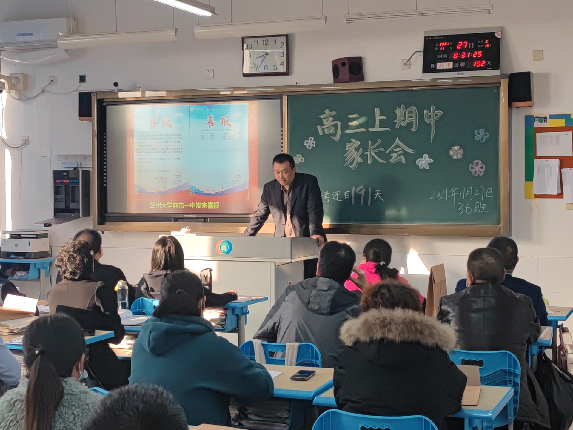 会上,各班主任向各位家长汇报了前半学期班级教育教学工作,并向家长全方位介绍了孩子在学校的学习情况;各任课教师准备了详实的材料,针对本学科特点做了详尽的汇报;部分班级设置了优秀学生和家长代表发言环节,分享了学习经验和家庭教育经验。对于助力190天后的2022年高考,班主任们给家长提出中肯的建议:大家不仅要关心孩子们的学习状态,更要关心孩子们的情绪波动和心理健康,做孩子们的心理疏导员、信息采集员和生活督导员。