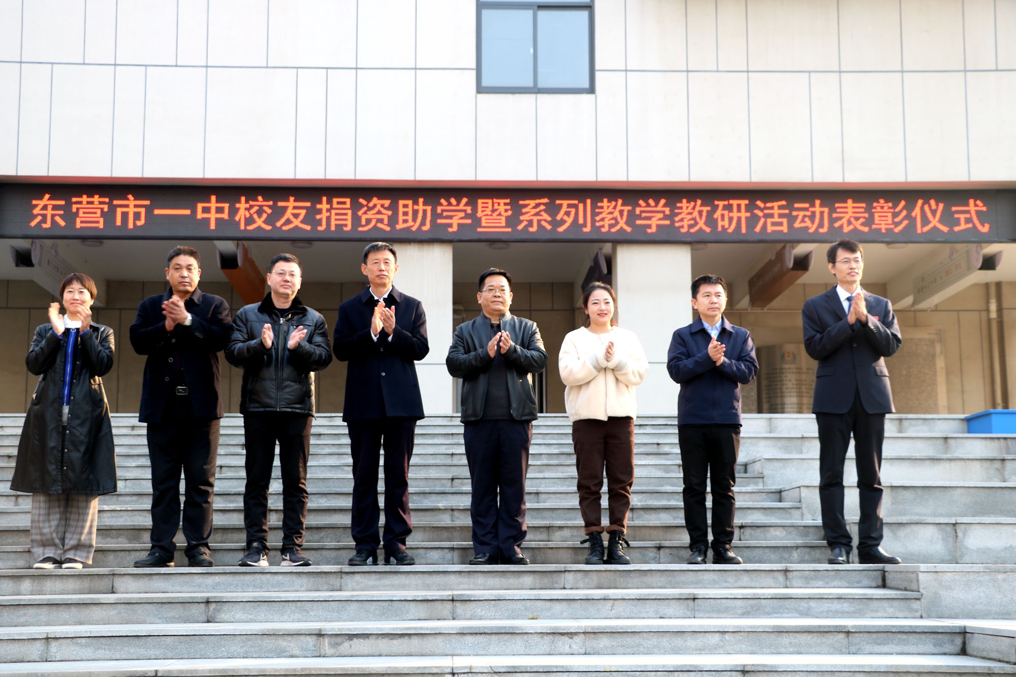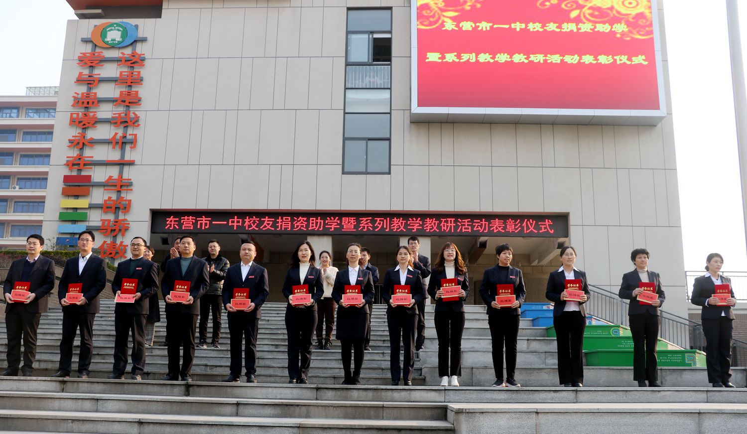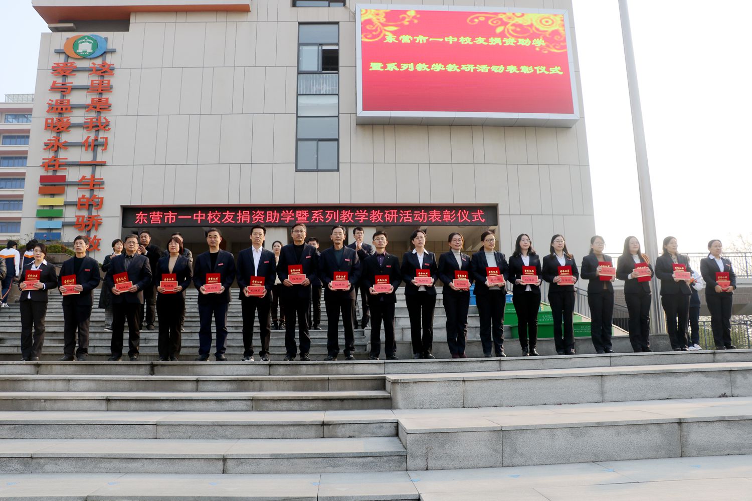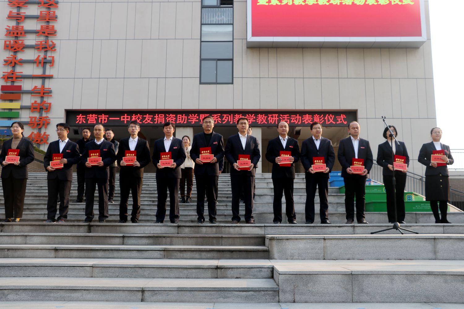 近日,市一中在升旗广场举行校友捐资助学暨系列教学教研活动表彰仪式。副校长李士刚、马占武和校友助学中心理事长张利,副理事长高汝国、宁鲁光;办公室主任单超,理事孙明山、王欣、王子坤等参加表彰仪式。教务处主任李衡斌主持仪式。