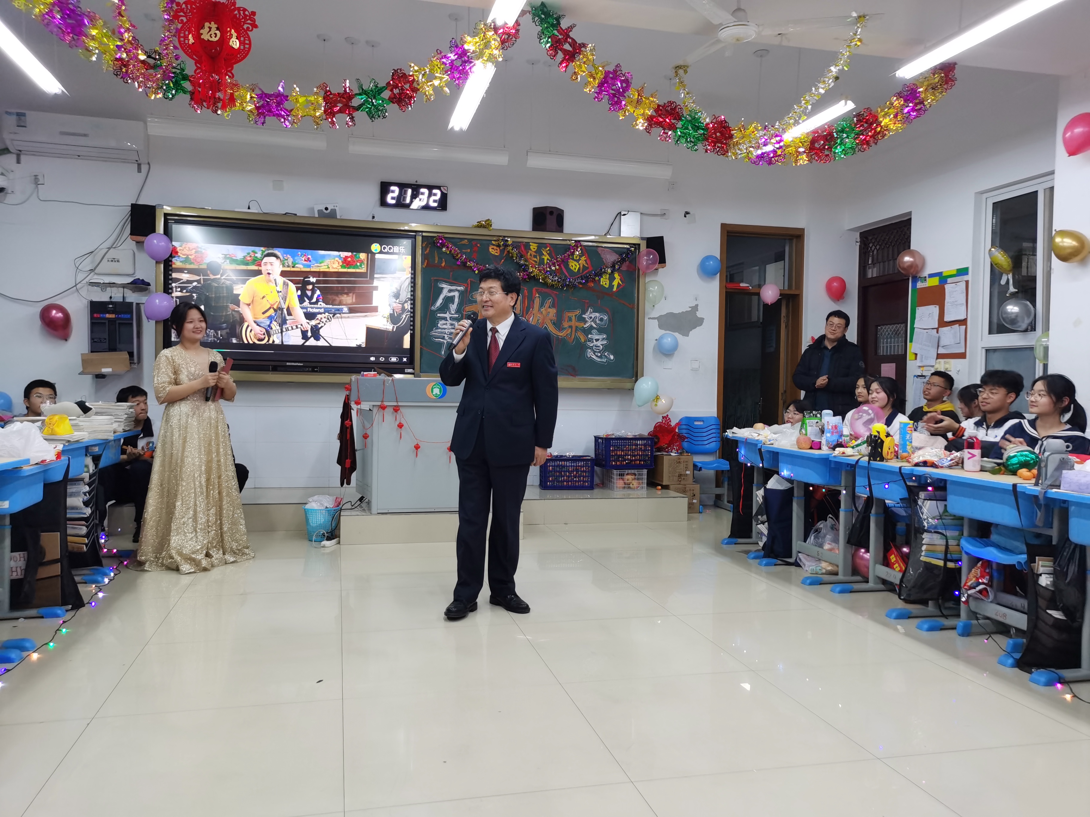 校内的三两雁鸭,红冠而白羽,也感受到了新年喜庆的氛围,或摇摆于路,或踏水而行。夜色渐浓而华灯初上,在全体师生的共同努力下,白天紧张忙碌的课堂摇身变为热情洋溢的大舞台。各班级精彩纷呈的节目,伴随着此起彼伏的笑声与欢呼声,让光华楼春意盎然。任课教师从三尺讲台走上班级晚会的舞台,各展才华,赢得了学生们雷鸣般的掌声。不少班级创新晚会组织方式,以照片或者钉钉直播的形式让家长们也参与到了这场盛会中。校内校外共此良辰共此盛情,好评如潮。