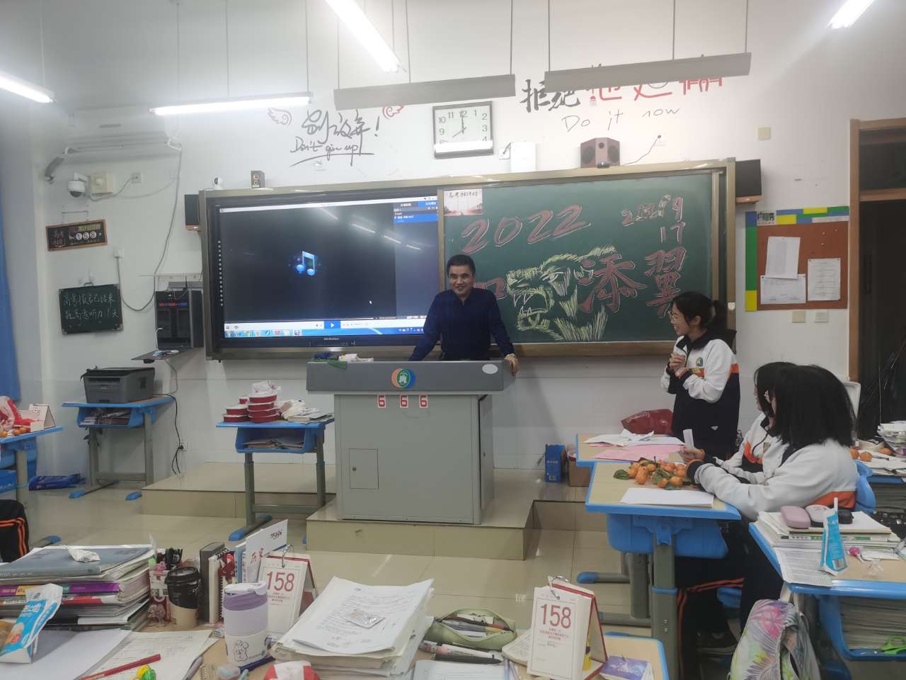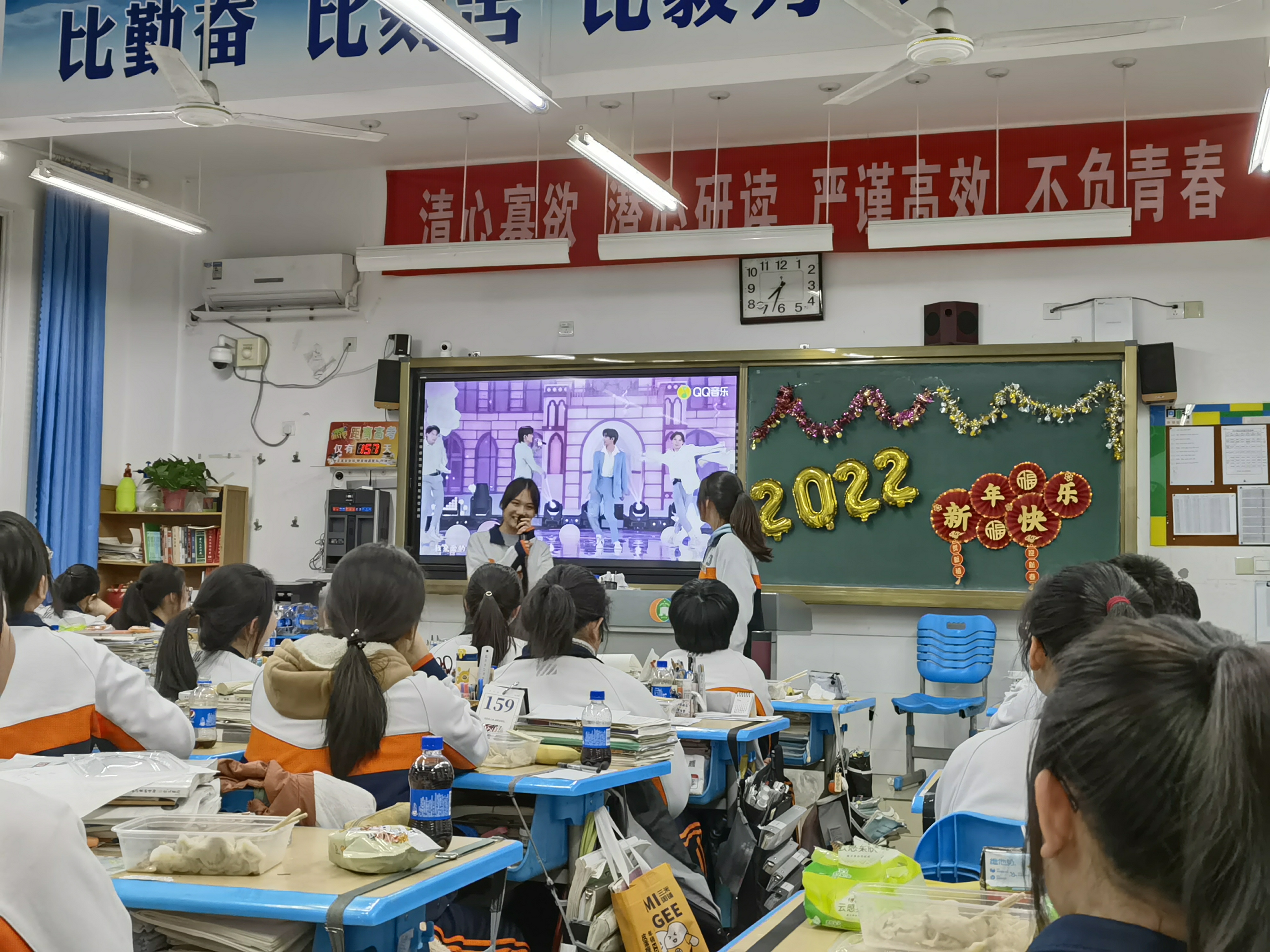 各班级由班主任组织同学欢度元旦,迎接新年。首先观看级部教师表演的元旦节目《我们都是一家人》,随后师生一起载歌载舞,欢乐开怀,其乐融融。