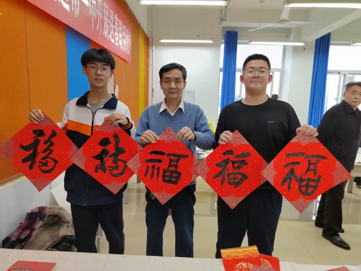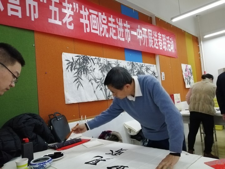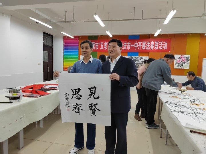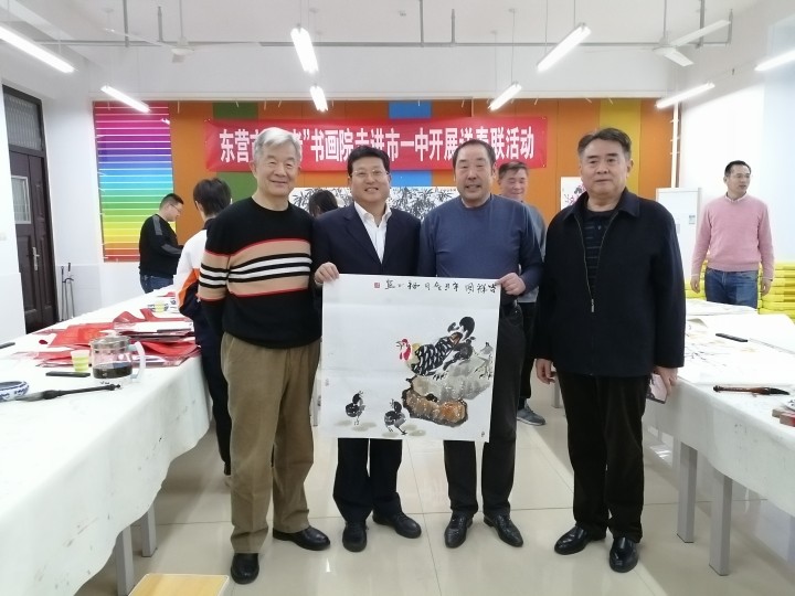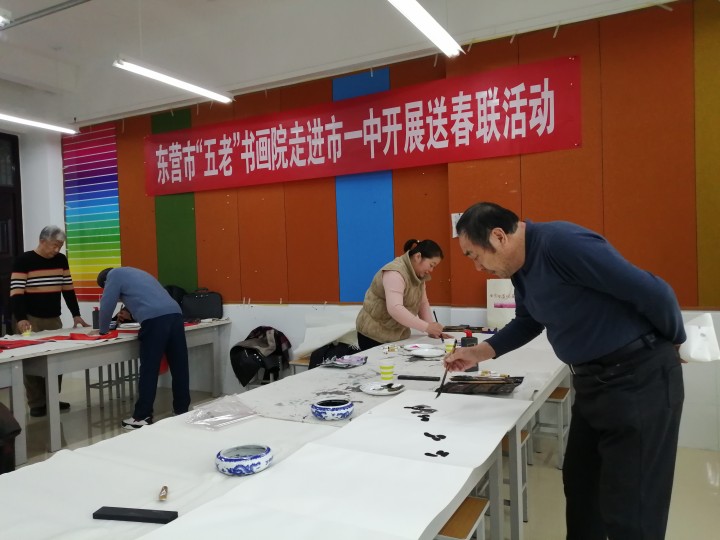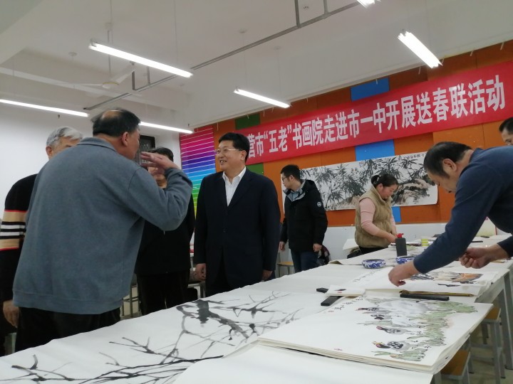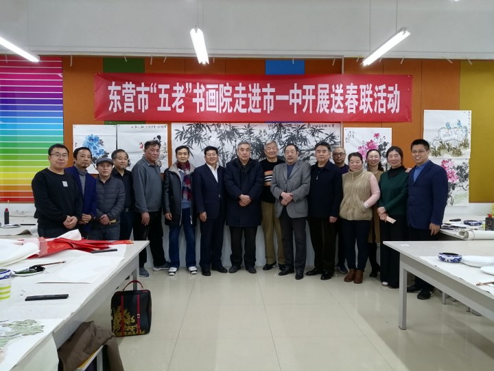 1月12日,东营市“五老”志愿者协会会长孙三民,书画院院长盖福山,秘书长韩祥明及艺术家刘宝麟、徐能凯、张守华、薄纯祥等一行,走进市一中开展书画进校园送春联活动。
