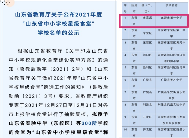 近日,东营市一中食堂被评为山东省首批“中小学校星级食堂”,是东营市高中学校中唯一获此殊荣的学校食堂。