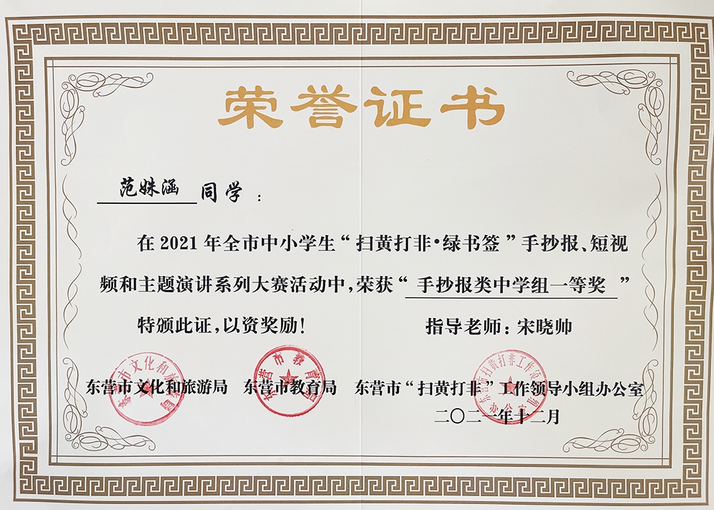 近日,在东营市文化和旅游局、东营市教育局、东营市“扫黄打非”工作领导小组办公室举办的2021年全市中小学生“扫黄打非·绿书签”手抄报、短视频和主题演讲系列大赛活动中,我校4名同学在全市中学组中获奖。