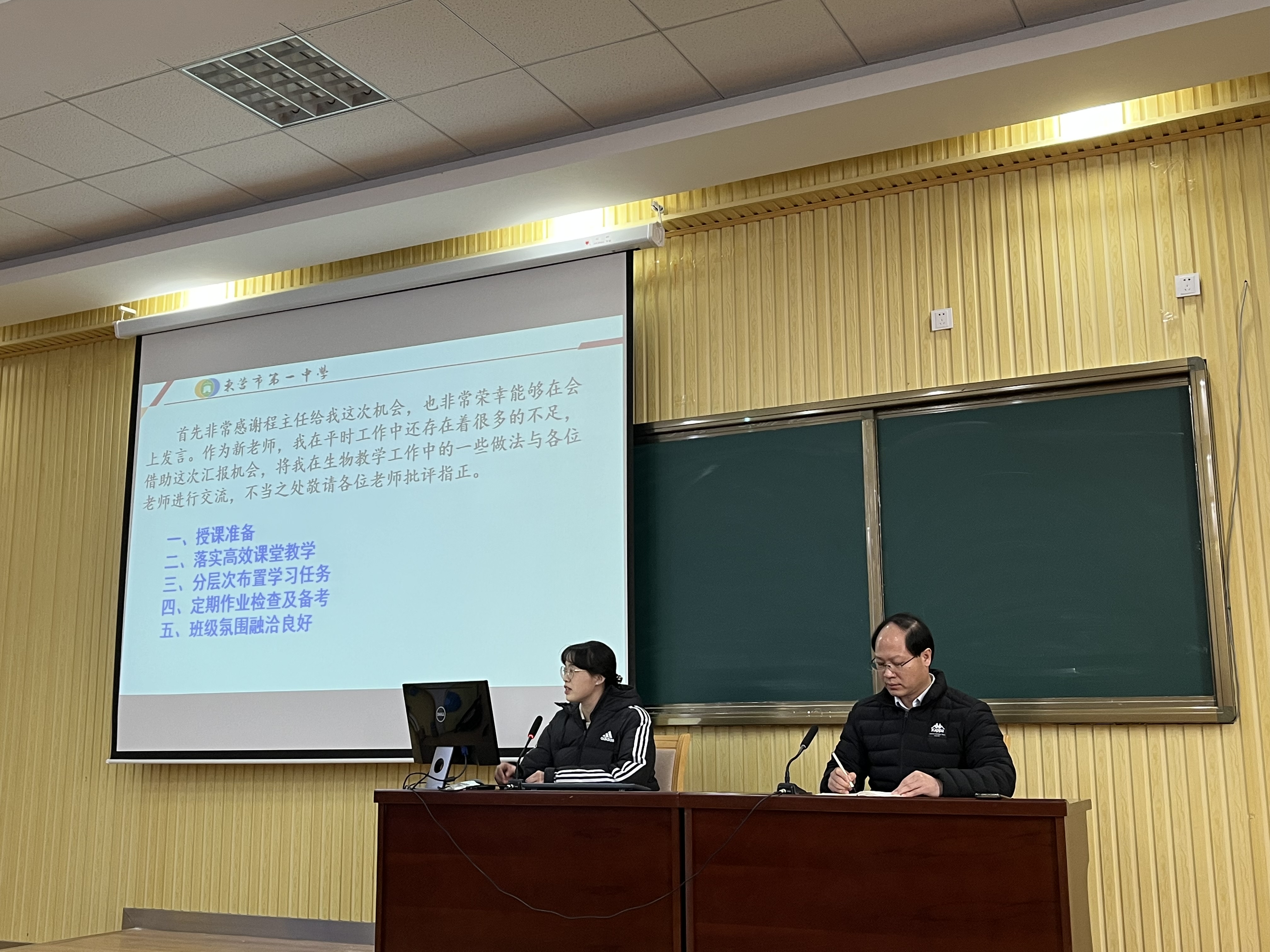 王欣老师作了题为《心存敬畏 任重道远》的报告,分享了她的教学心得:作为一位新入职的老师,教学上虚心向老教师请教;平时多听课多学习,注重习题的讲解;充分利用碎片化时间,加强课前提问;分层次布置教学任务,提高自习效率,并定期进行作业检查。