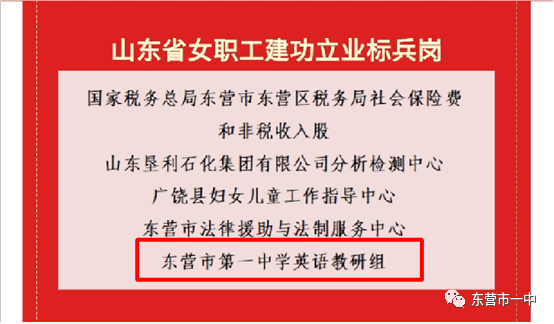 教研组长尹国红是山东省教学能手、东营名师、东营市学科带头人,东营市科研骨干,同时也是山东省“跟进式指导教师”骨干教师团队成员,省中小学教师培训“优秀指导教师”,市“高中英语教学教研”评选工作专家,市高中英语兼职教研员;骨干教师庞玲获山东省优质课一等奖;赵淑丽获山东省微课评比一等奖,魏芳芳获市一等奖;丁玲等2人获东营市“学科带头人”称号;周芳芳等10人获“东营市教学能手”称号,吴萍萍等6人获“山东省高考优秀阅卷员”称号;程德芸等12人获东营市优质课一等奖;刘婷婷等8人获东营市优课一等奖;华秀梅等11人次执教全市高三复习观摩课,李雅媛等9人次在全市做高三备考经验分享;庞玲等3人被聘为东营市高中英语兼职教研员。97人次被学校评为高考功勋教师、优秀教师、最受学生欢迎的老师、最让群众满意的党员等。另外,41人在各级学术期刊发表论文90余篇,18人在市级以上论文评比获市一等奖。