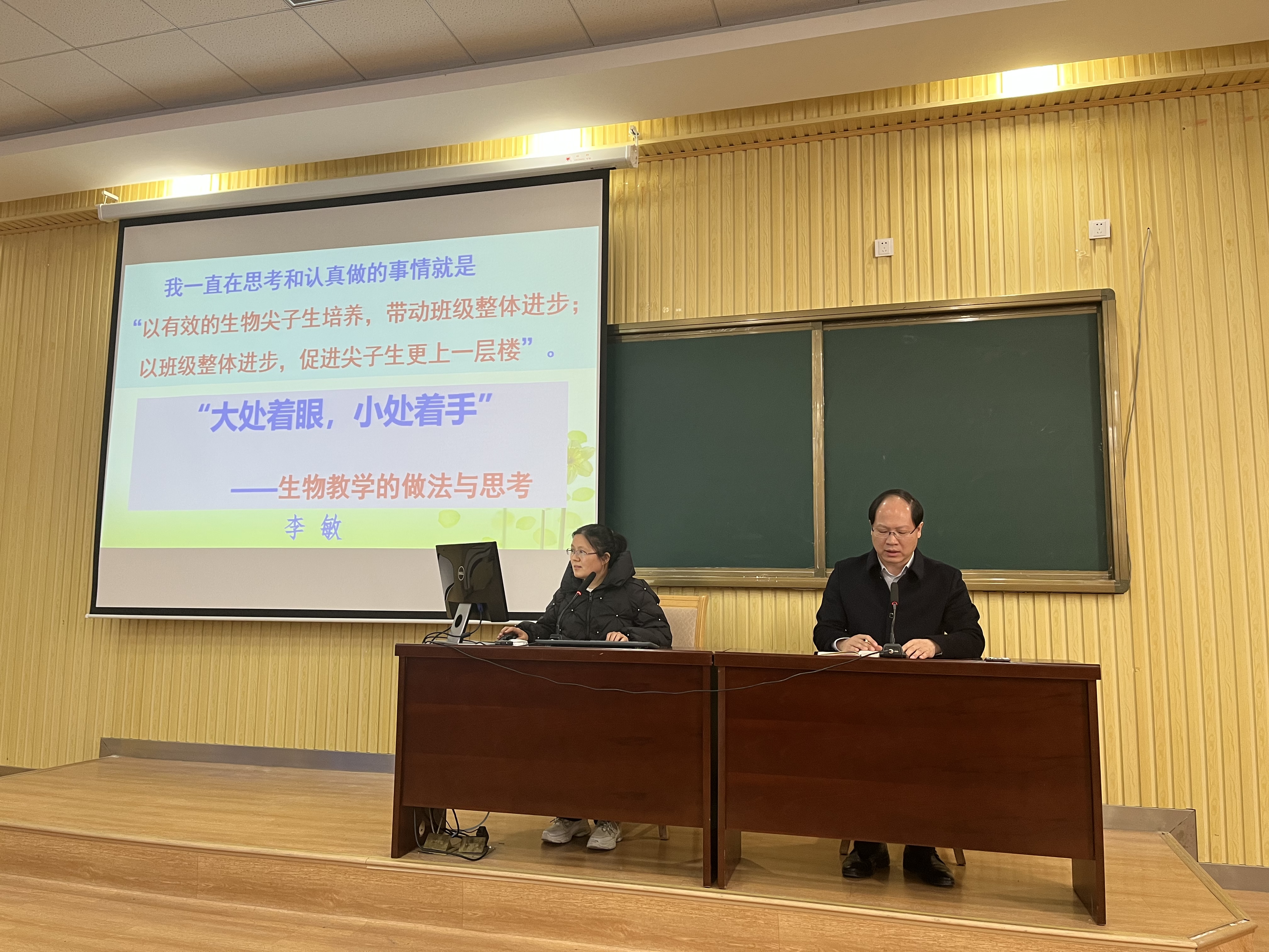 在高二阶梯教室,2020级部举行了第6期名师讲堂,生物组李敏老师做了题为“大处着眼,小处着手”的教学经验分享,2020级部全体教师参会。