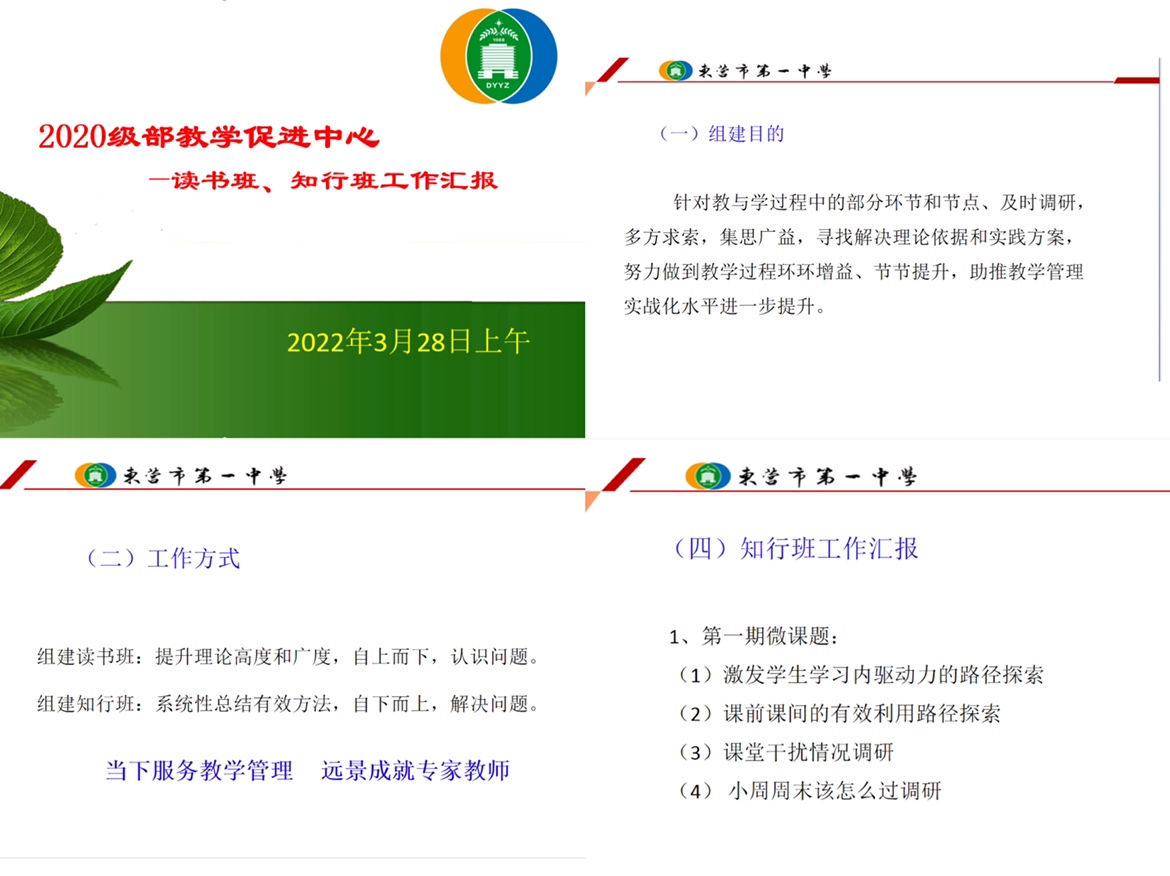 李芳、姜运亮两位老师分别担任读书班、知行班班长。班级中每个小组的三位教师相互配合,共同研究小组课题形成汇报课件。读书班重在提升理论高度和广度,自上而下,认识问题;知行班重在系统性总结有效方法,自下而上,解决问题。读书班、知行班相互促进。