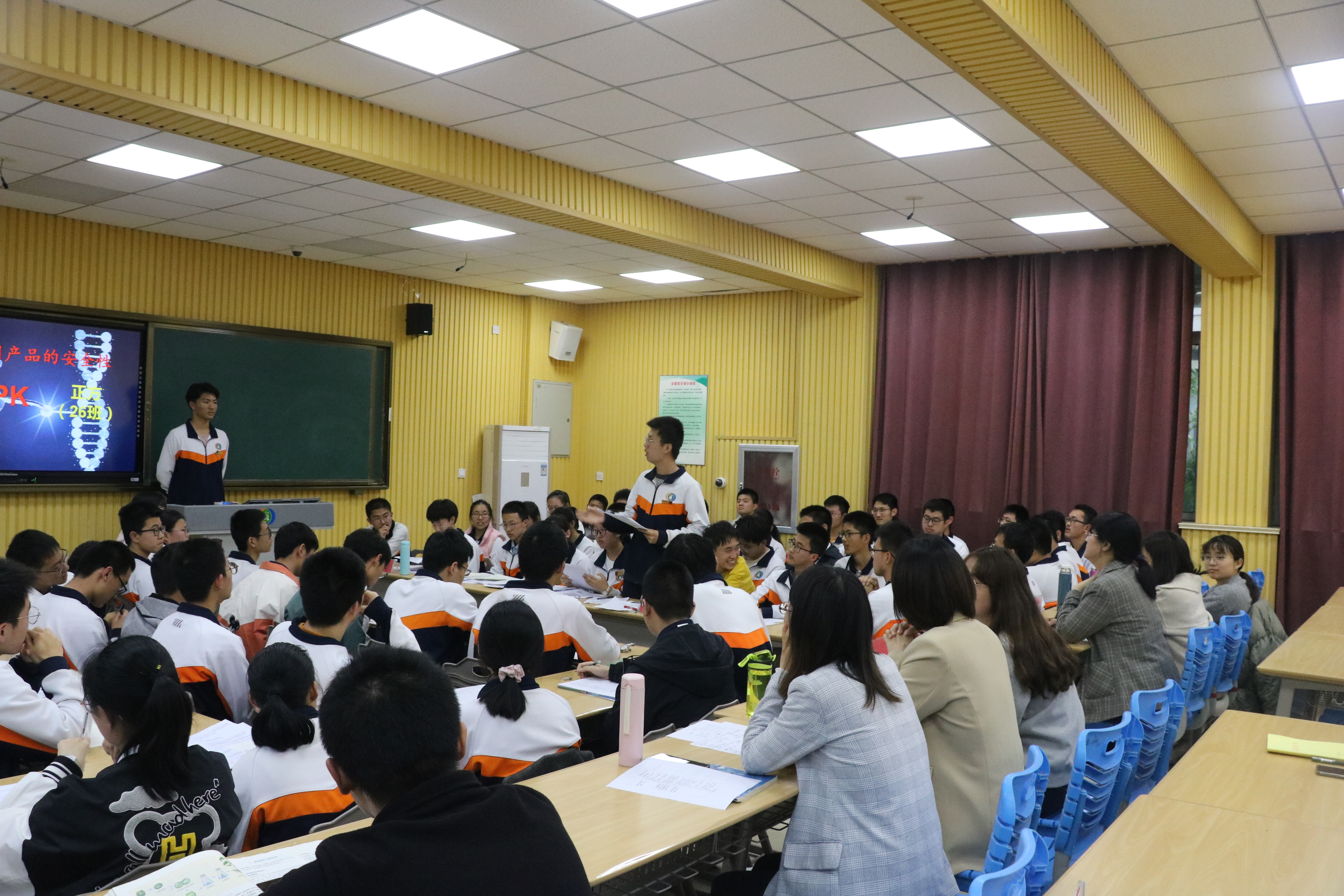 4月28日,2020级部25班、26班的学生在高二北录播室举行了“转基因产品安全性”辩论赛。高一、高二生物教师担任评委,程志伟主任现场观看了比赛。