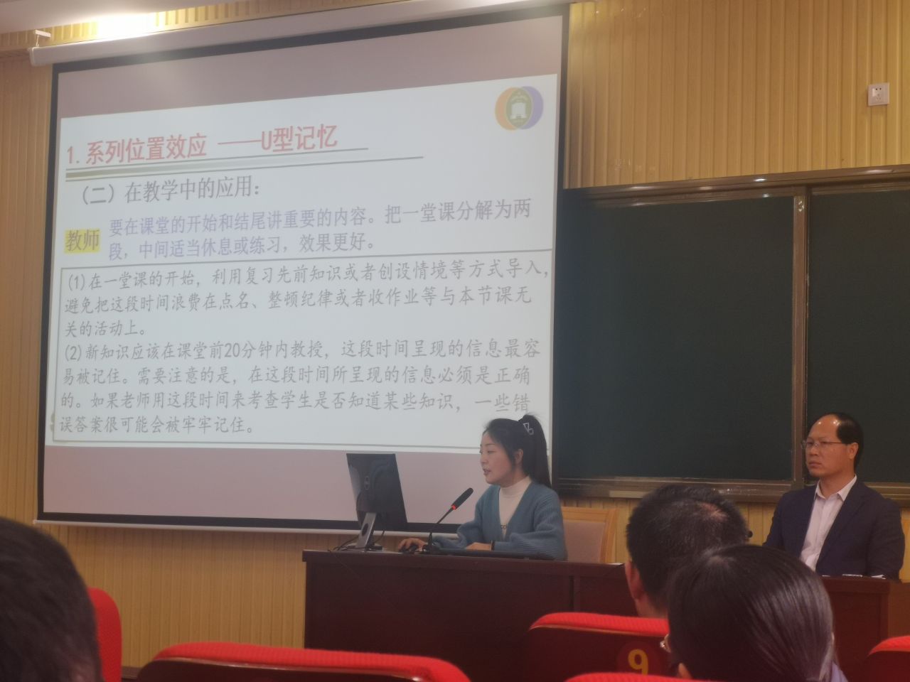 武海静老师深入浅出的分析了U型记忆、7±2法则、首因效应和近因效应、超限效应等多种心理效应在教学中的应用。武老师的报告内容丰富多彩、深刻透彻、实用性强,对教学有很强的指导意义,获得了参会教师的一致好评。