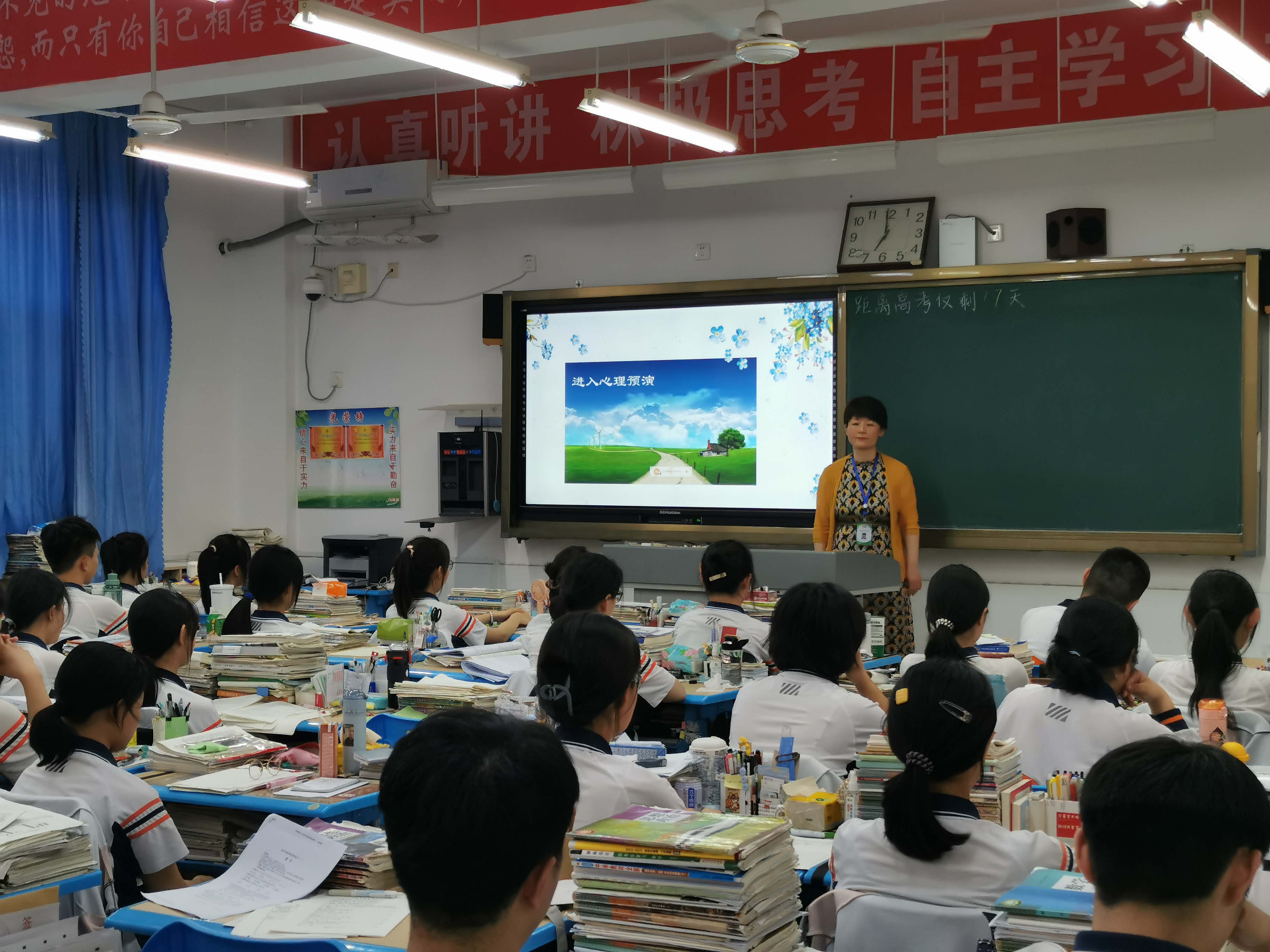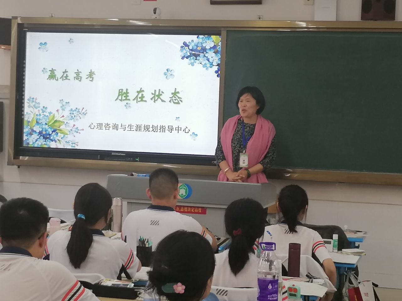 课堂上,心理咨询家长志愿者们,首先带领同学们回顾了之前心理辅导课上学习过的“减压小妙招”,重点带领同学们做了“腹式呼吸”的放松练习。为进一步帮助考生塑造最佳的心理状态,老师们带领同学们在冥想中进行了高考全过程的“心理预演”。科学、细致的环节设计,带领同学们在想象中体验了一场高考。最后,通过“蝴蝶拍”的心理小技巧,将同学们自己最好的感觉和状态植入心底,并带着这种严谨、自信投入到高考备考中去。