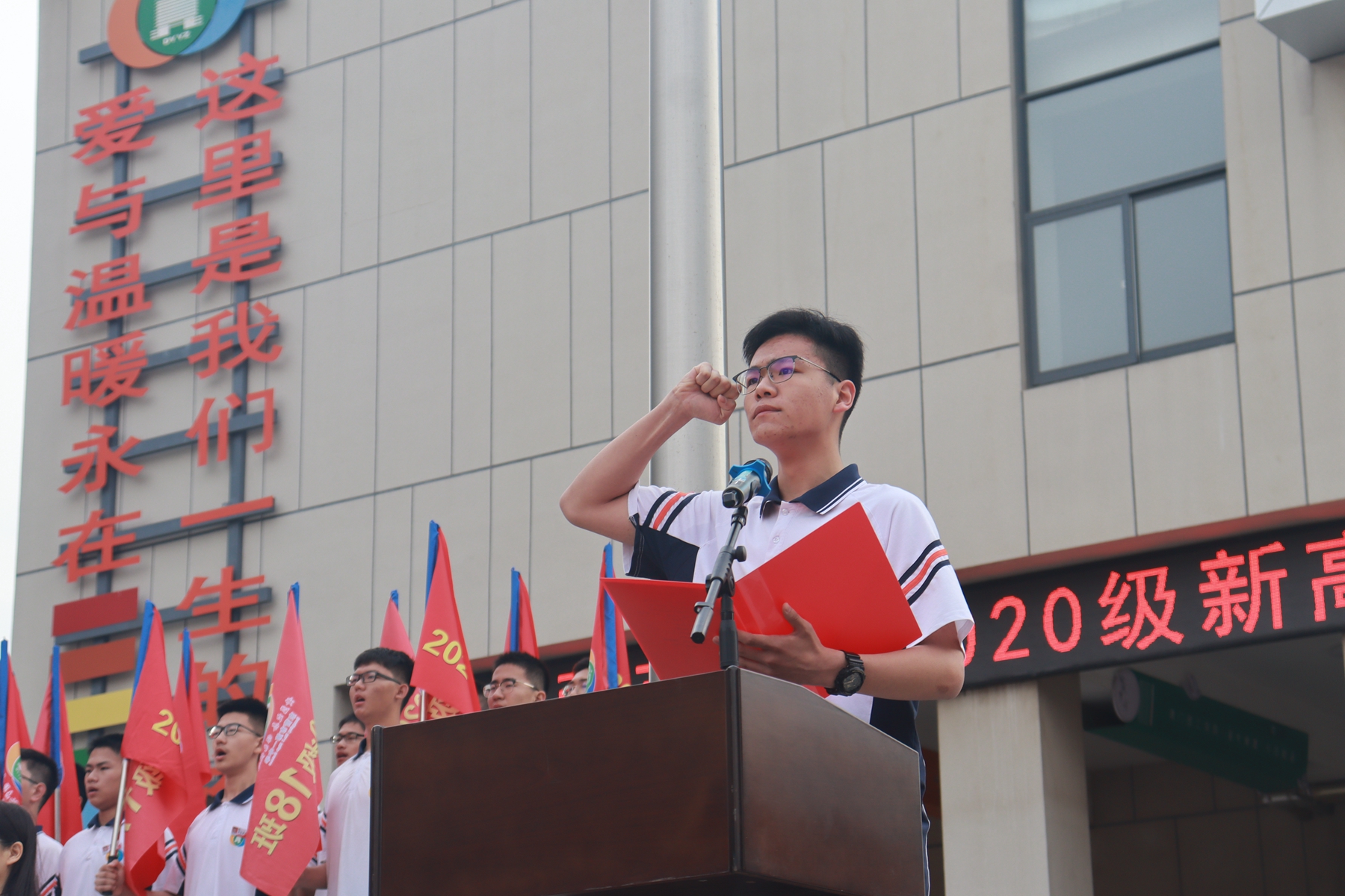 2020级全体同学在吴柏辰同学的带领下集体宣誓:“激情高三,奋发为雄!迎难而上,搏浪长风!吾辈英才,言出必行!二三高考,我必成功!”铮铮誓言在一中校园上空久久地回荡,彰显了全体新高三同学努力学习的决心、必能成功的信心。