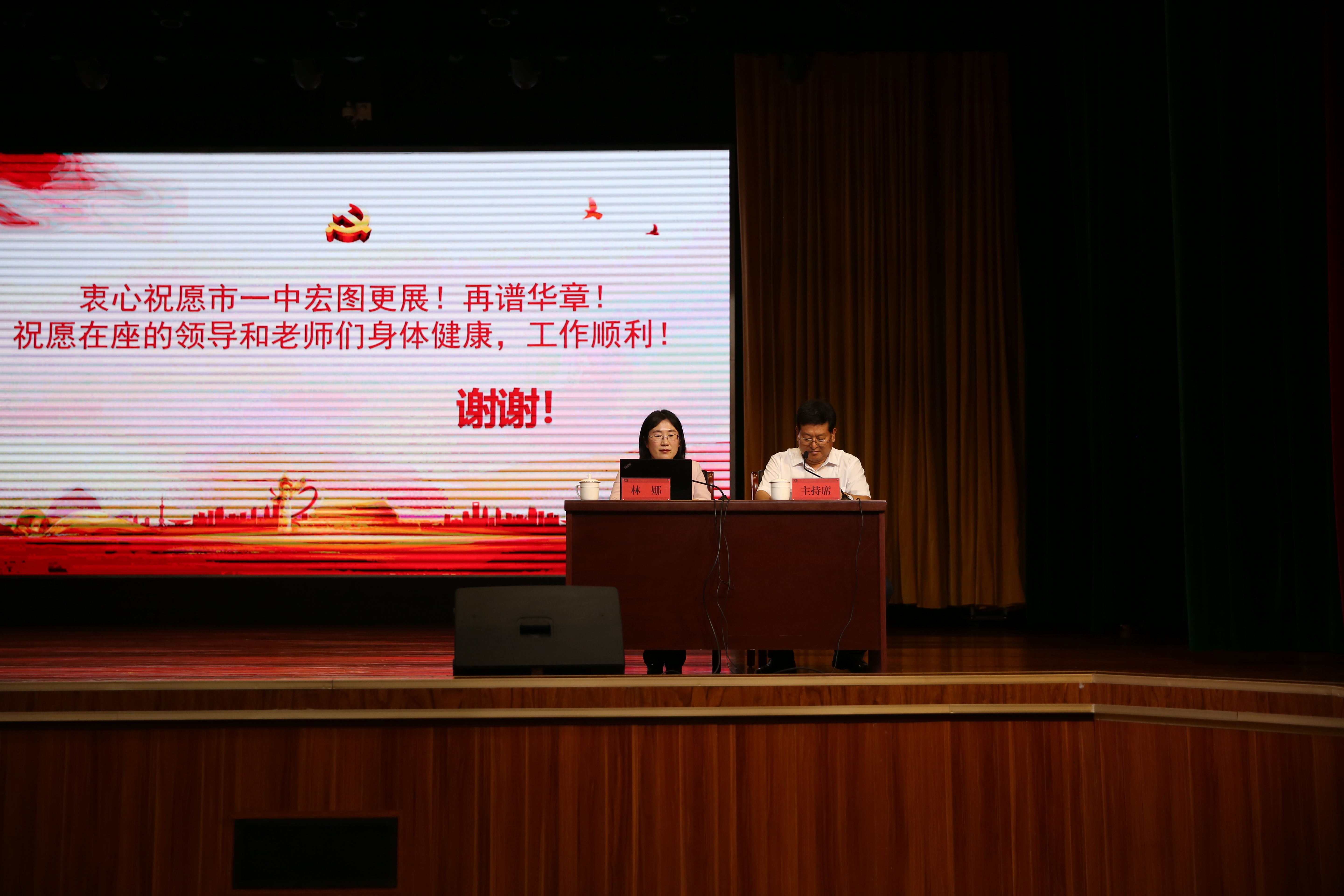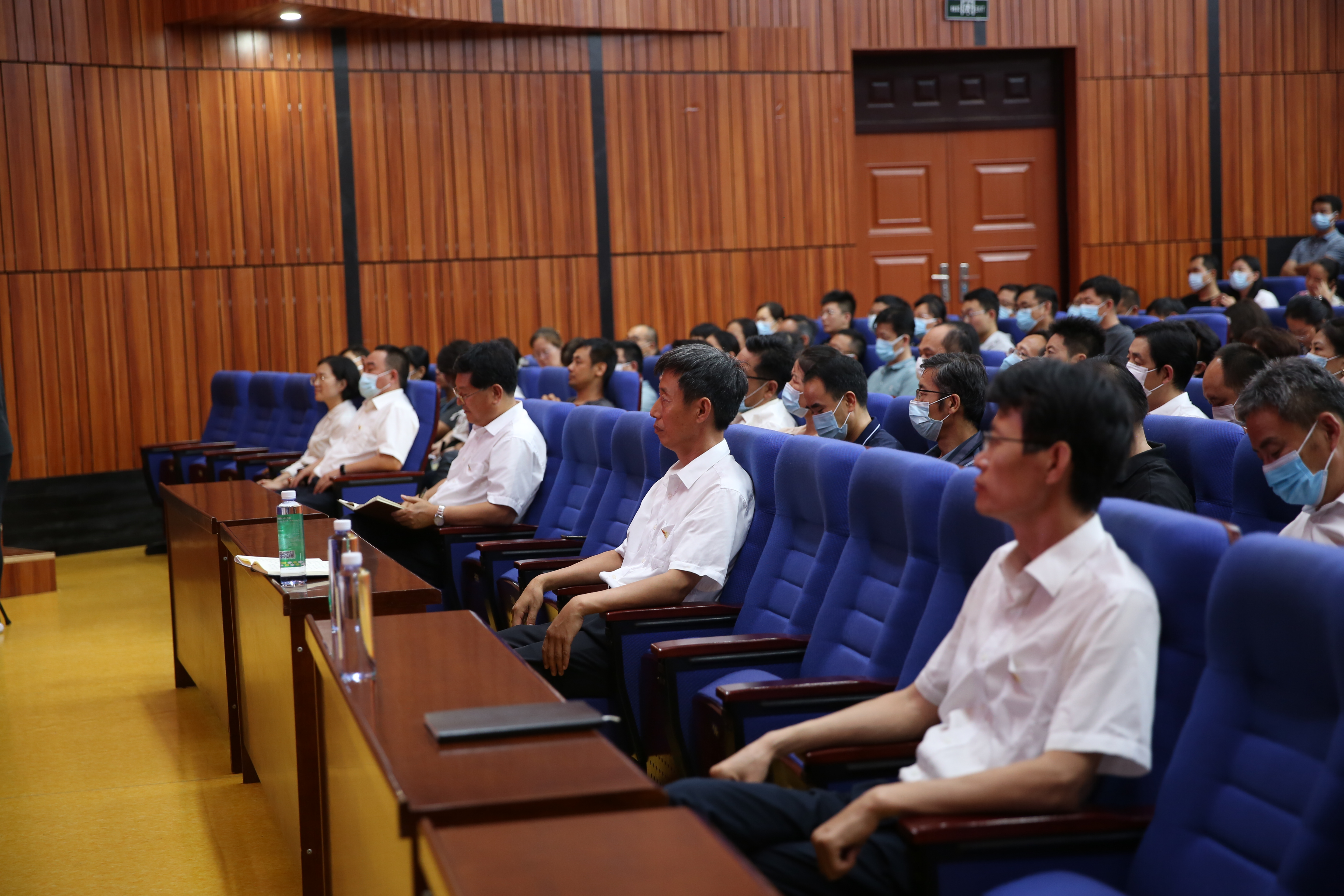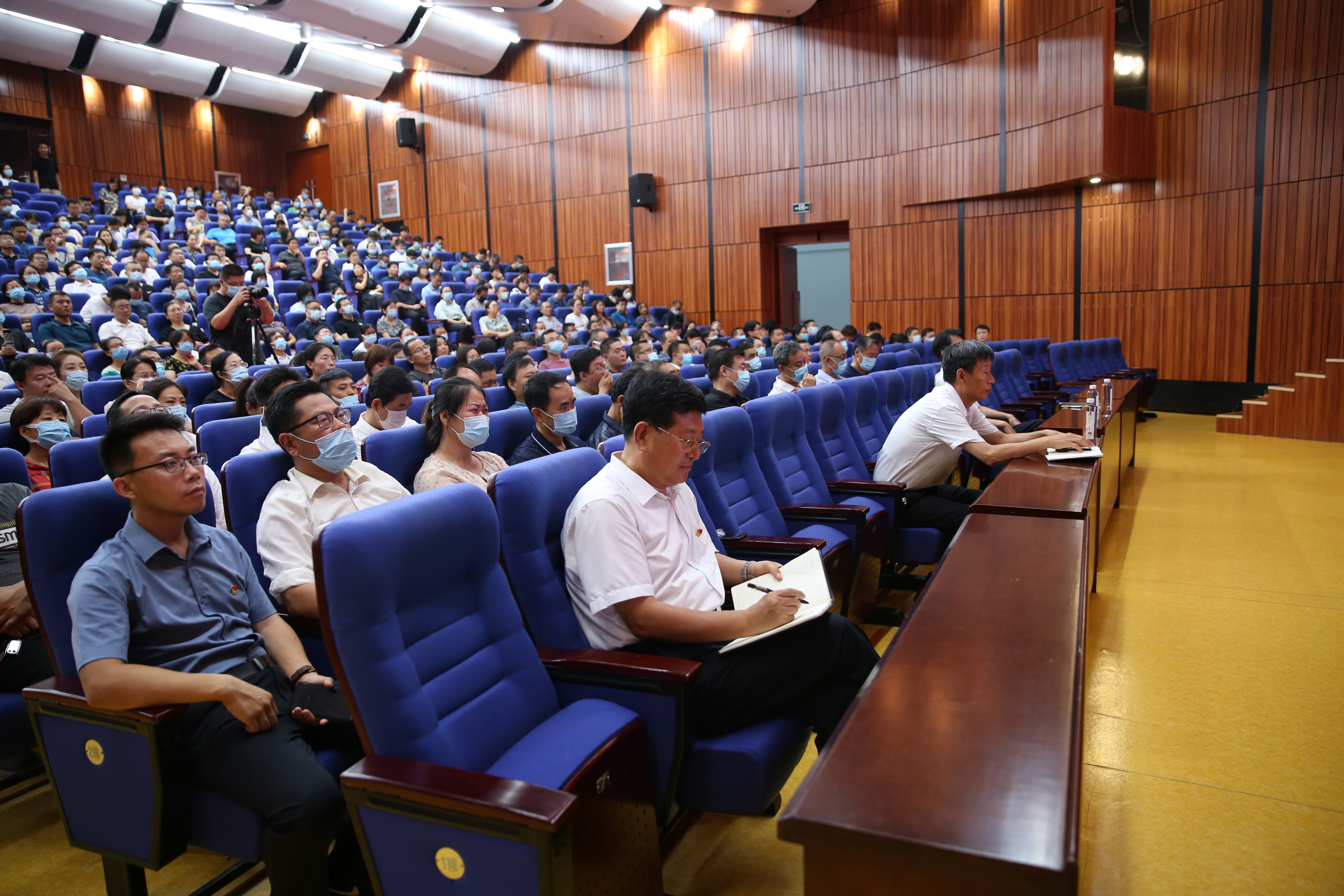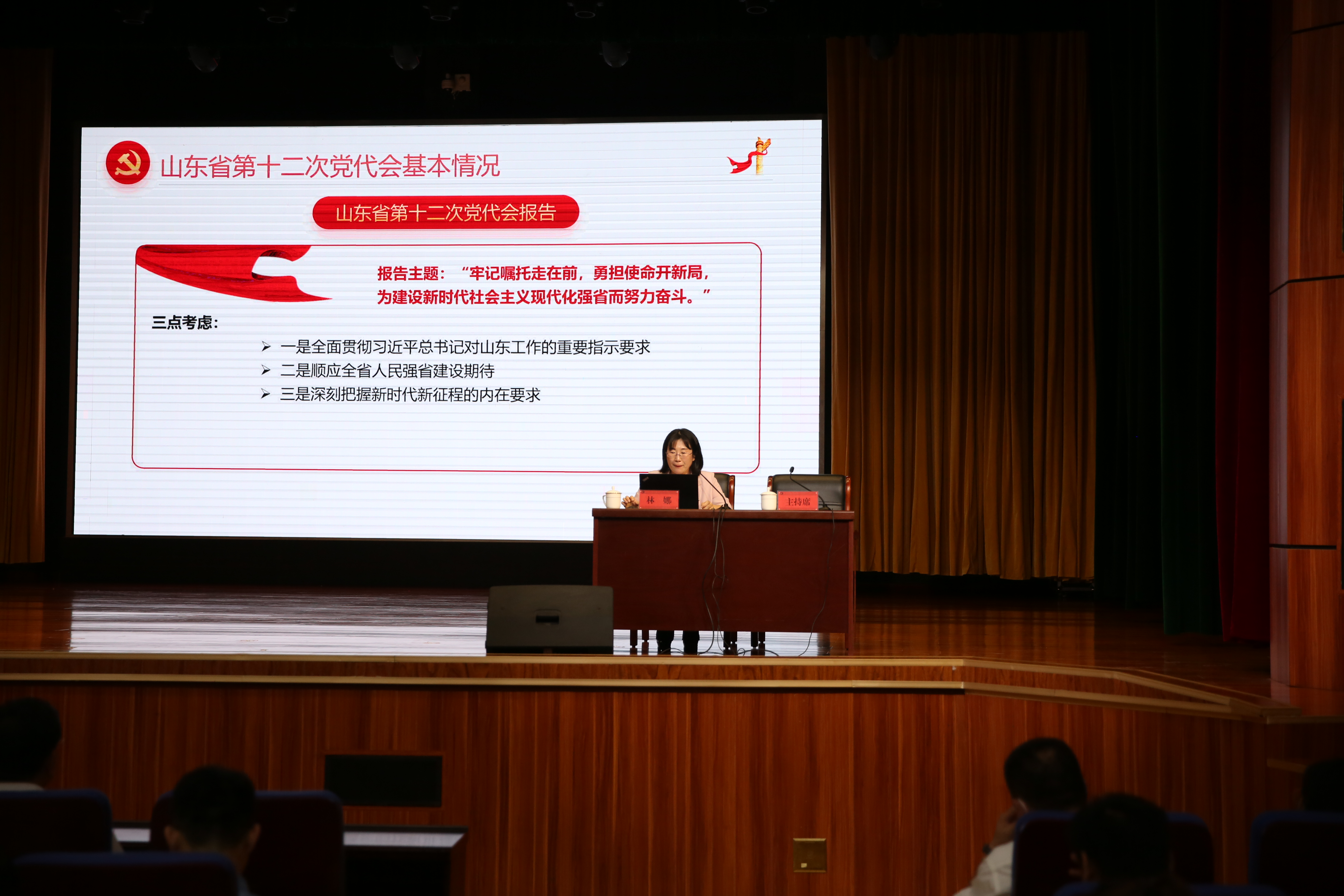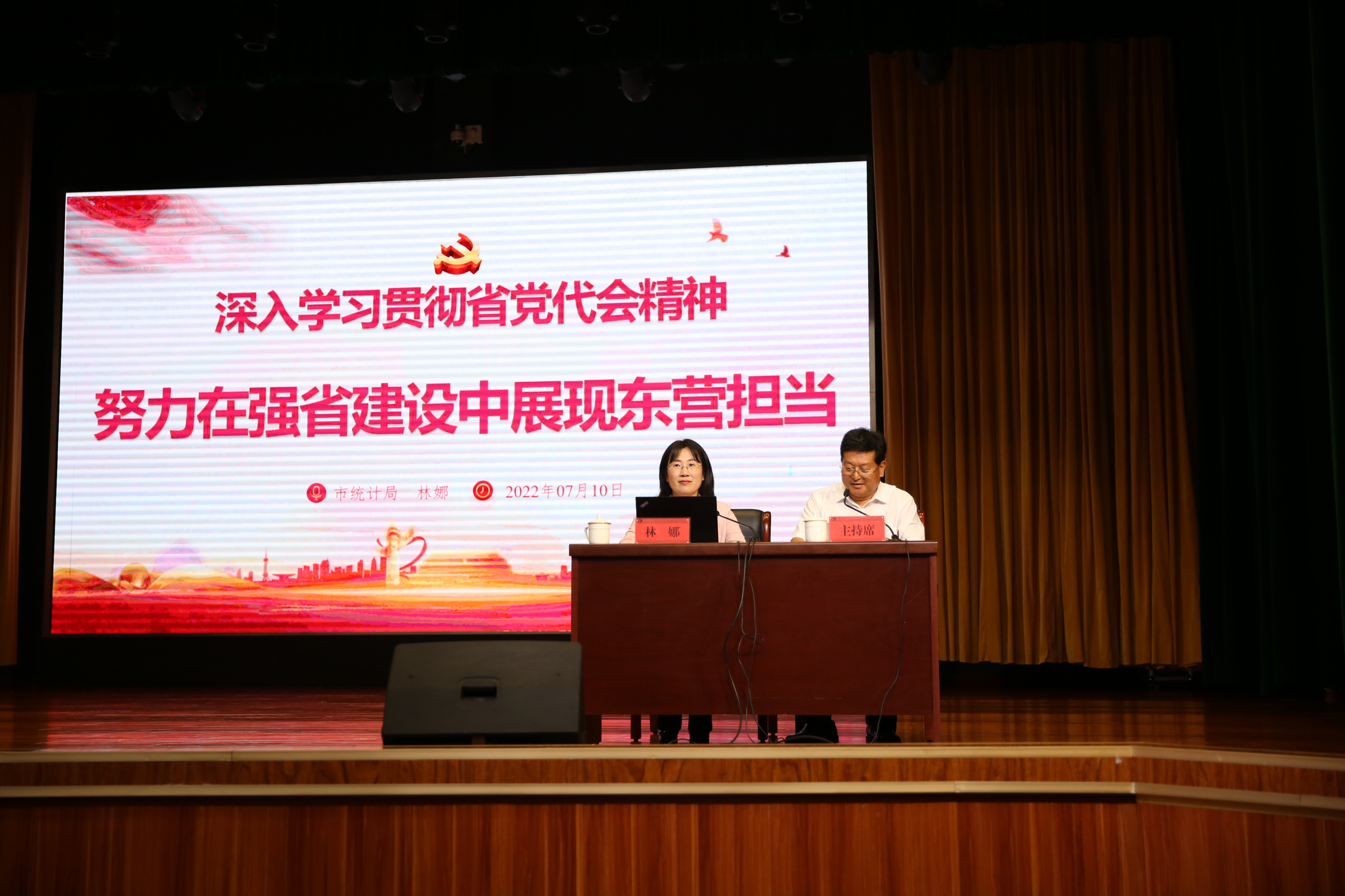 7月10日晚上,我校在道德讲堂召开学习贯彻省第十二次党代会精神宣讲报告会。东营市委宣讲团成员、市统计局副局长林娜同志作专题宣讲,学校领导、中层干部和全体在职教师参会并认真学习聆听。宣讲报告会由学校党委书记、校长史本泉同志主持。.jpg)