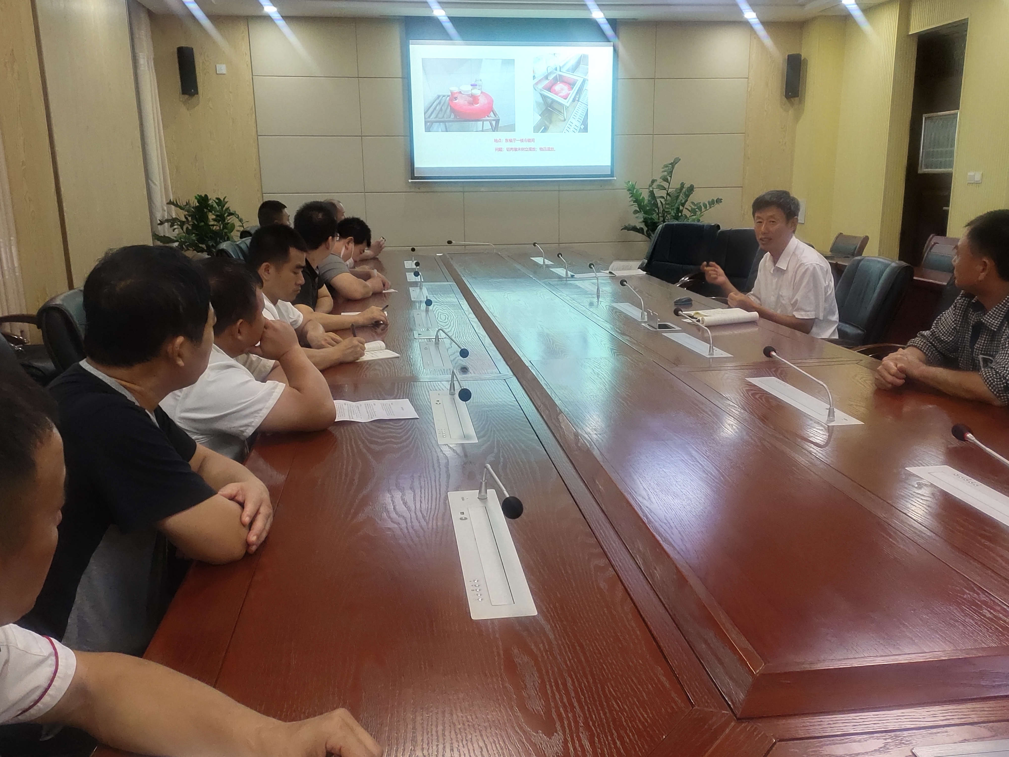 第三阶段,李士刚副校长传达了即将开展的“全省学校疫情防控及校园安全工作督导”的具体要求,他讲到,食品安全是保障教育教学有序开展的十分重要的工作,食品安全红线不能触碰。学校领导一直高度重视食品安全,要结合本次检查要求,做好日常的安全管理,自查自纠,以严格的标准做好迎检的各项工作。最后针对近期秋季开学食堂安全检查中发现的隐患问题,李校长结合2022年2月22日刚实施的《食品安全国家标准:餐饮服务通用卫生规范GB31654-2021》,对整改要求逐一进行了规范解读和具体要求,相关人员、班组做到即知即改,要做到措施到位,责任到人,形成长效机制,杜绝隐患。