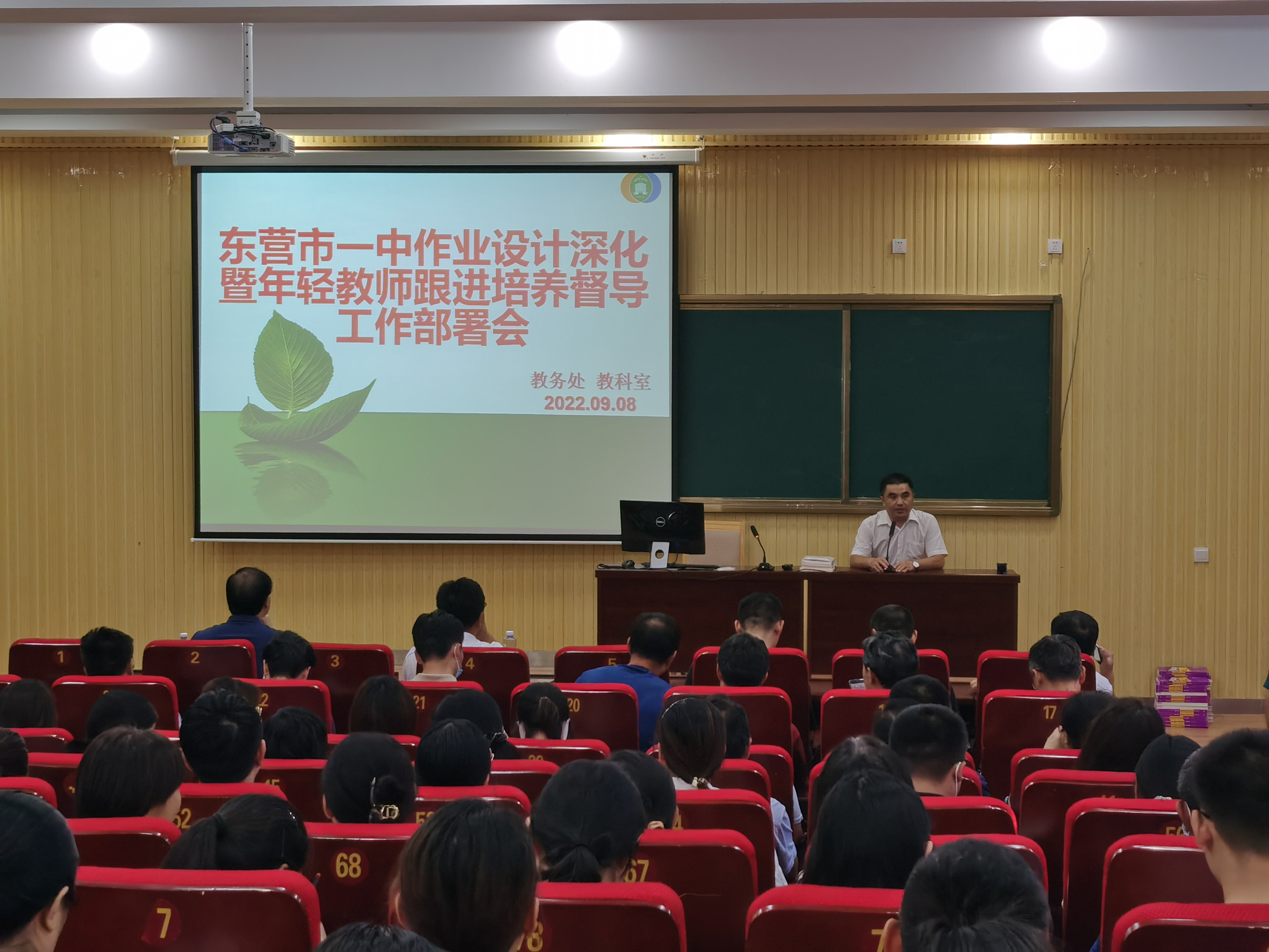9月8日下午,东营市第一中学作业设计深化提升暨年轻教师跟进培养工作部署启动会召开,就本学期工作计划中作业设计深化与年轻教师跟进培养等两项重点工作进行详细部署和安排,学校教务处主任李衡斌和教科室主任陈杰分别对两项工作进行了具体部署和安排,明确职责分工和工作节点,明晰工作措施与落实手段。学校全科教研组长、各年级教学组长,各年级部主任、分工教学教研的副主任,年轻教师及其导师,共计150多人参加会议。