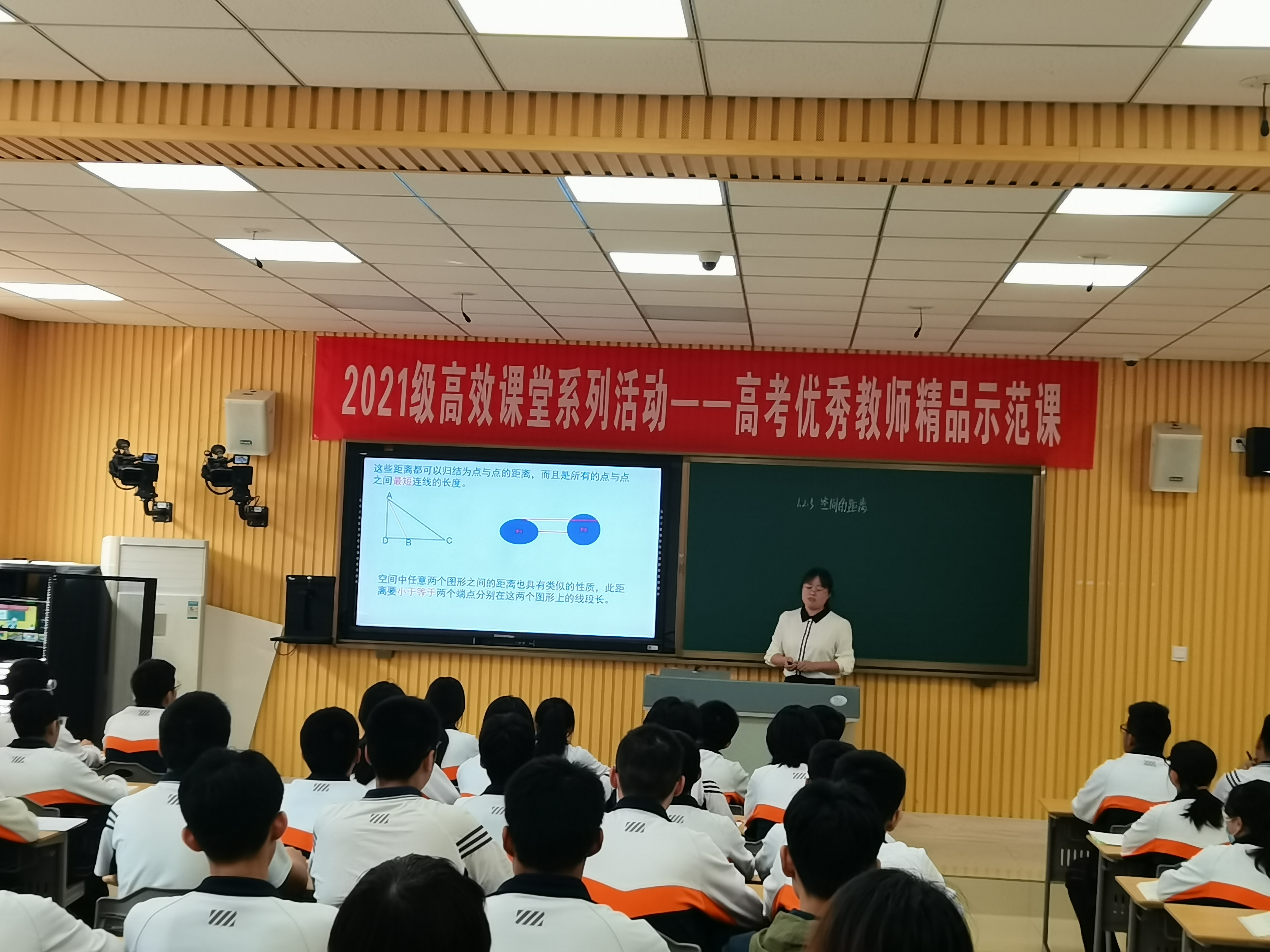数学组马金玲老师作为骨干教师,精心准备,以有效的教学设计,娴熟的教学技艺,丰富的教学经验,扎实的课堂训练,为我们呈献出一堂高水平的《空间中的距离》示范课。在执教过程中,她以饱满的热情去感染学生,引导其在宽松的、愉快的氛围中学习。学生听讲认真,时而沉眉思索,时而奋笔疾书,热情地参与到练习中。老师激情澎湃,学生兴趣盎然,洋溢着我校师生互动的浓厚氛围。
