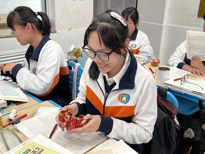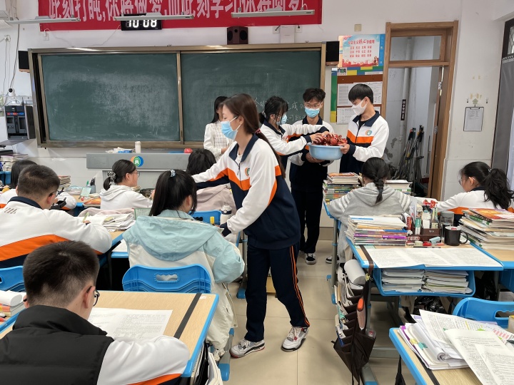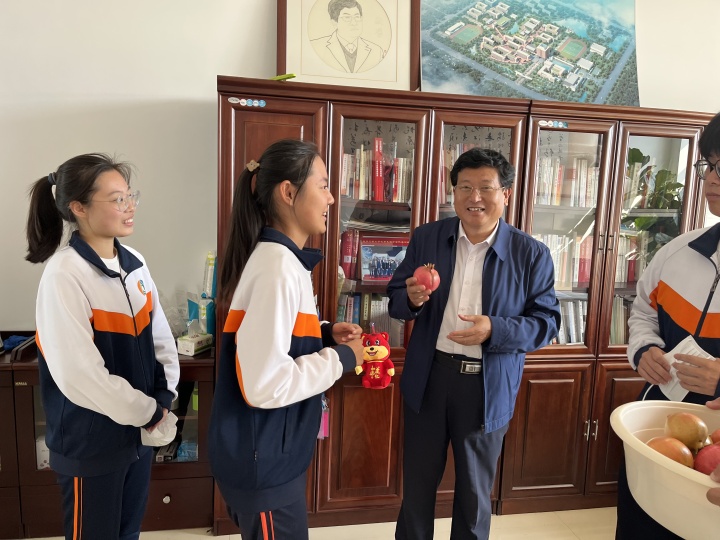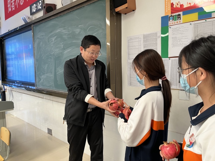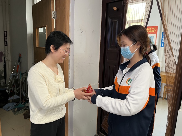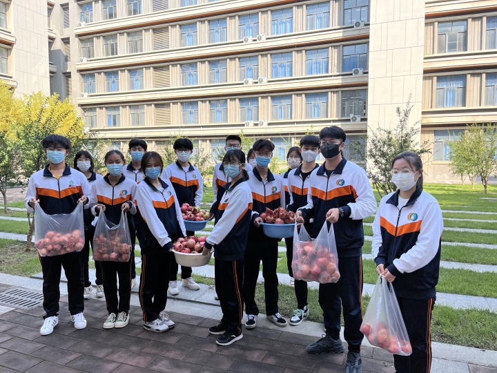 同学们将采摘下来的果实送给了高三教师和高三的同学们,祝老师们教育成果丰硕,祝福高三学子在未来的一年里,如同校园里的果树一样收获累累硕果!
