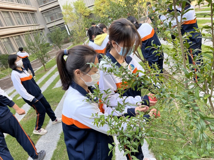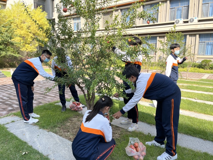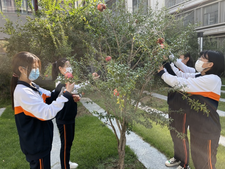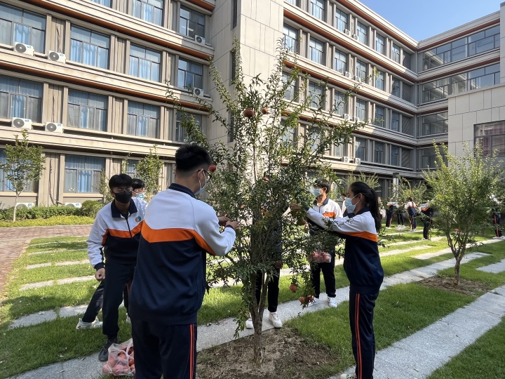 金秋十月,果实盈枝,美丽的市一中校园里,金黄的柿子,火红的山楂,还有咧着嘴笑的石榴,在绿叶的映衬下红得耀眼、亮得张扬。10月8日上午,学校团委组织在校的部分高三学生进行了校园秋实采摘活动。