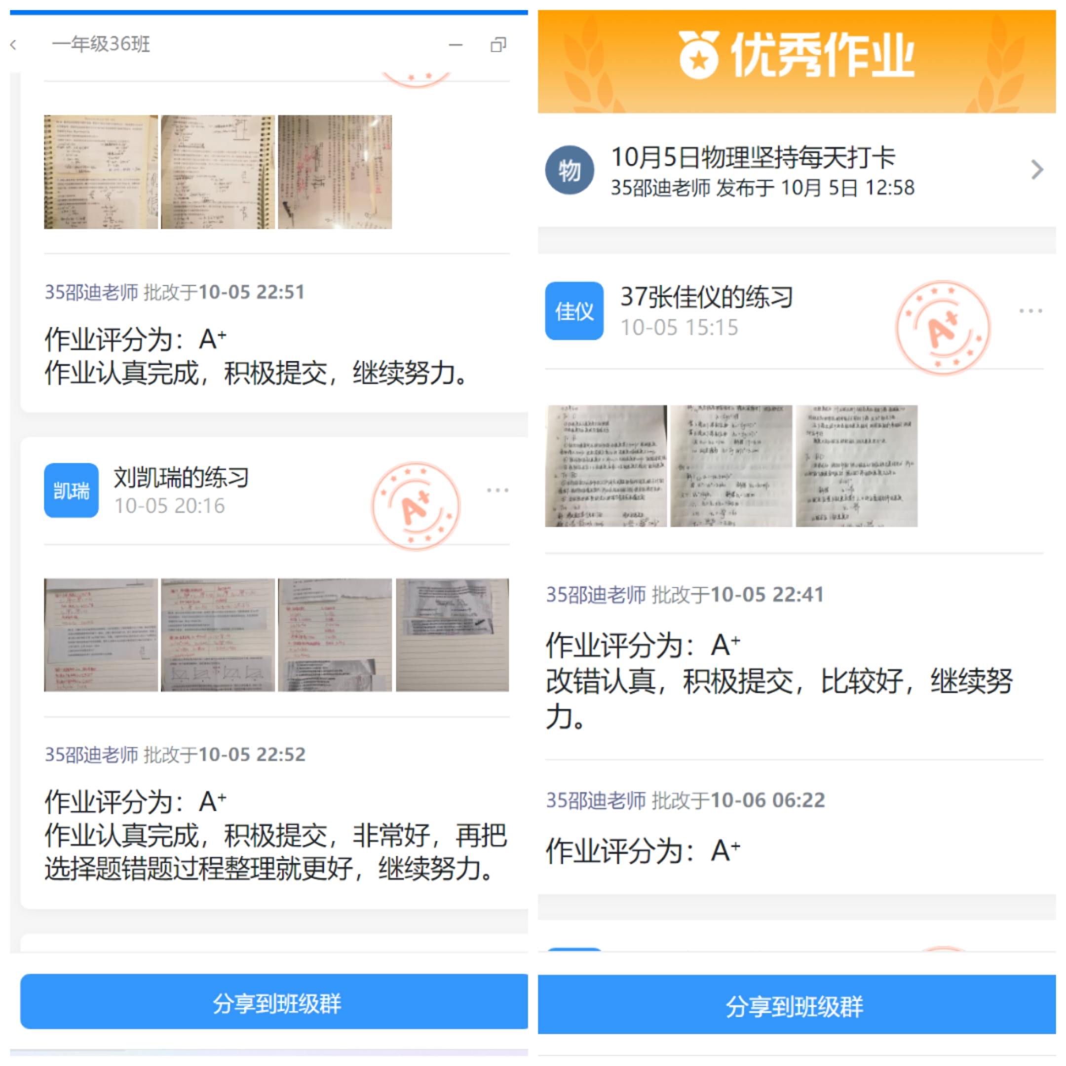 课堂效果要保证,课后的作业辅导必不可少。教师们及时关注本班学生完成作业的情况,细化要求,提高标准,从审题到书写,从答题思路到作答规范,老师们都给出了详细的点评。