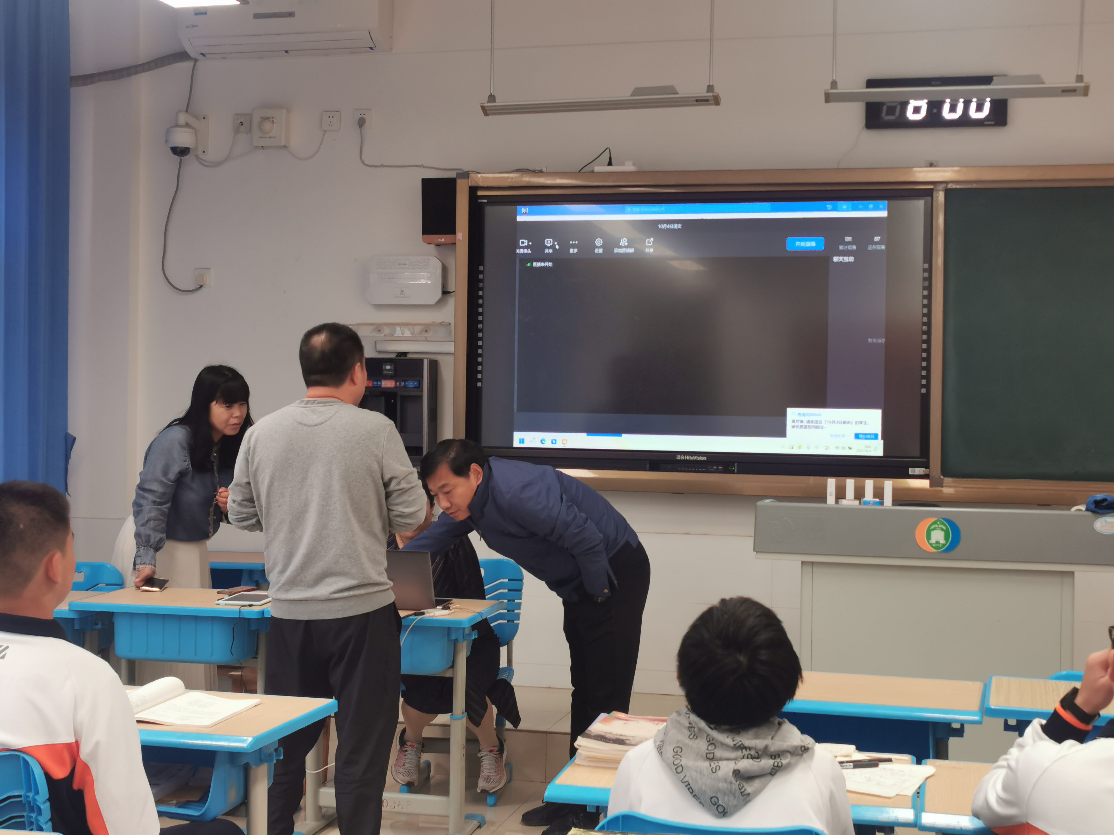 很快,线上上课的详细课表就已出台,并通过线上快速传达到各个学生手中,线上上课正式拉开帷幕。为保证上课效果,更真实地再现课堂教学,各学科组合力探讨,授课教师精心准备、提前到位,到教室进行直播,直至课堂完满落幕。从确定上课地点,到准备上课设备,到每一位上课的老师的课堂准备,张建辉主任都在现场盯靠陪伴,随时准备解决遇到的一切问题,直到课堂顺利开始,他才悄然离开。