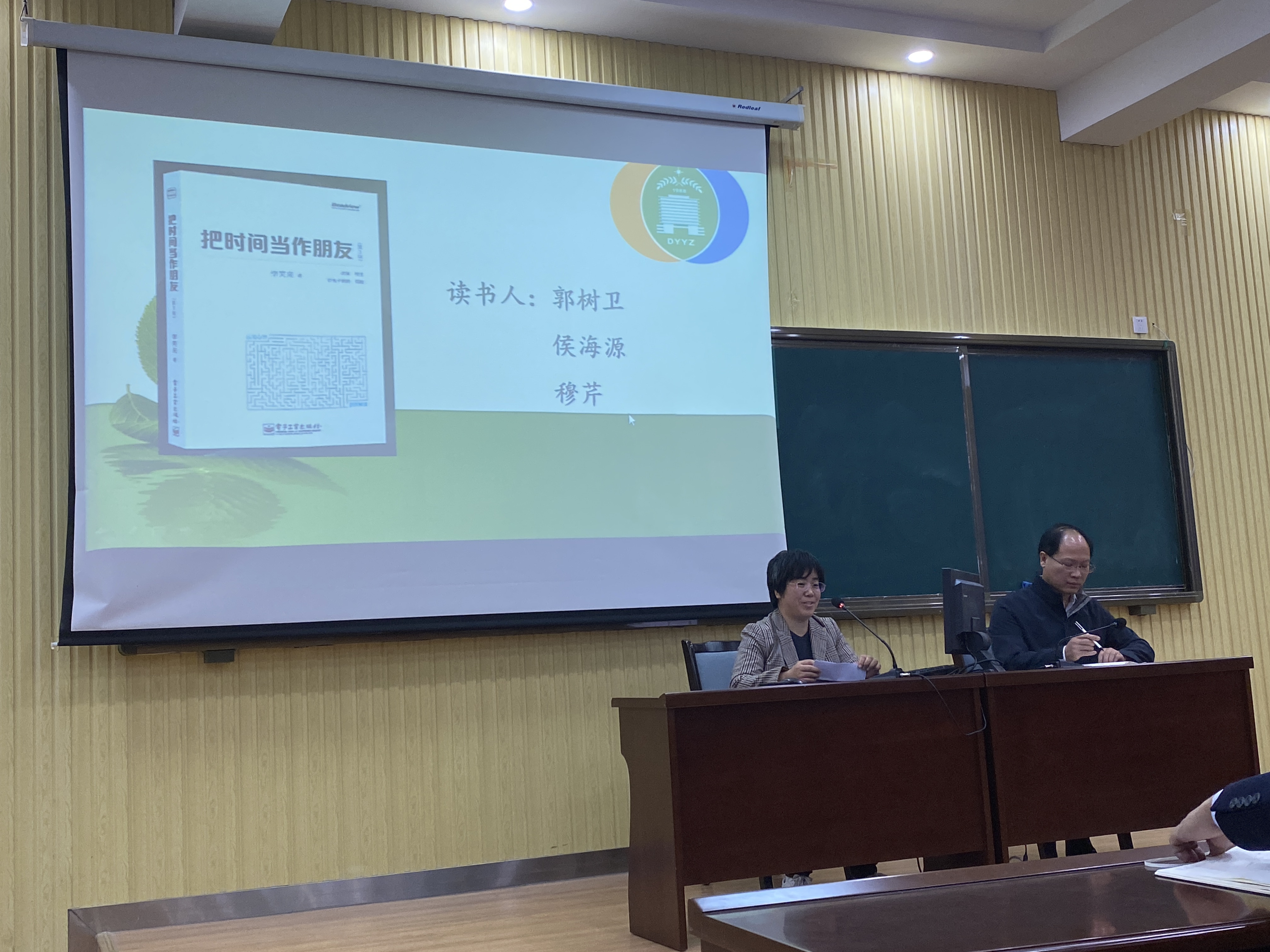 会上,第一期读书班五组郭树卫老师分享了所读书籍《把时间当做朋友》的阅读感受。郭老师从时间管理、现实、把时间当作朋友三个方面谈了自己的认识。郭老师谈到:我们无法管理时间,我们真正能管理的是我们自己;“接受现实”,对于我们来说很重要的一点就是热爱手中的这份工作,享受这份不完美的生活!郭老师深入浅出、幽默风趣的分享赢得了老师们的阵阵掌声。