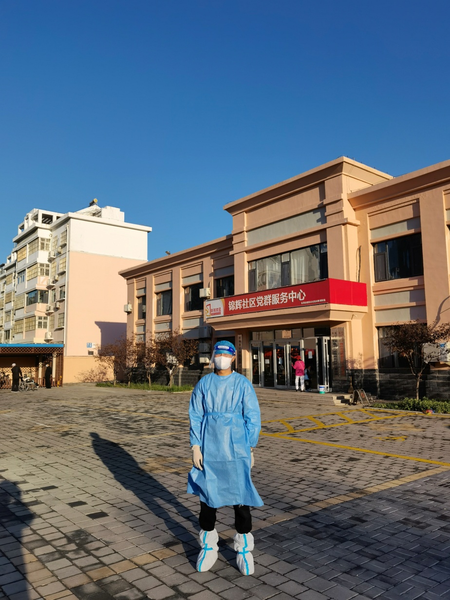 国庆7天,祝天旭老师先后辗转于锦苑、锦泰和锦辉三个社区。他每天早晨5点40分到达社区,开始做好核酸检测的准备工作,穿好防护服、带好口罩和护目镜。