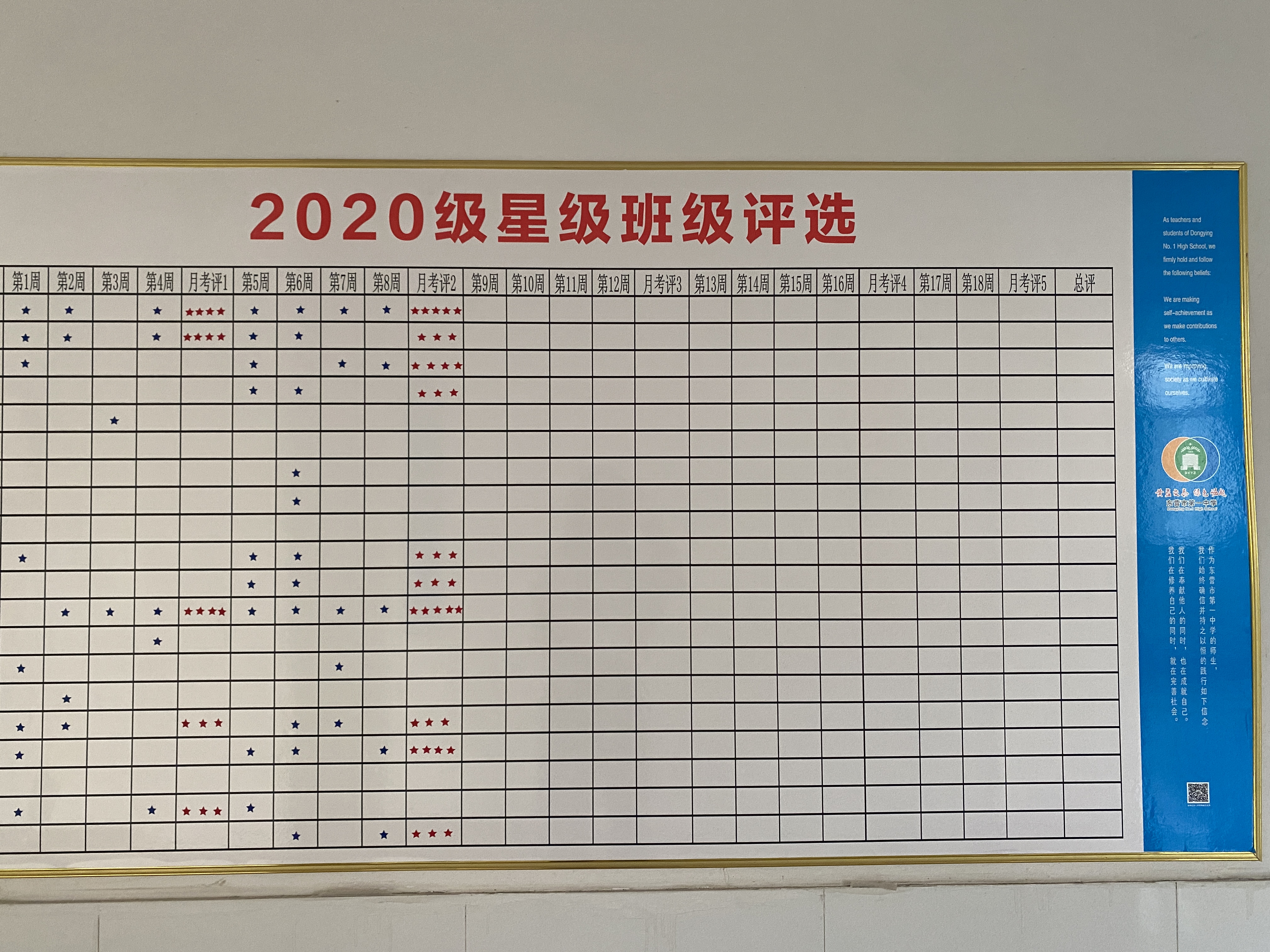 星级班级评选,是2020级部开展的助力学生成长、加强班级管理的综合评比活动。级部以周为单位,对各班一周内的宿舍卫生管理、两休秩序、餐厅及卫生区卫生、课堂秩序、考试成绩等各项进行检查并量化评价。根据每月获得优秀次数授予评比前列的班级三星级班级、四星级班级、五星级班级称号,发放流动红旗,并在教学楼各入口处张榜展示评比结果。截至目前,共评出三星级班级14个、四星级班级9个、五星级班级2个。