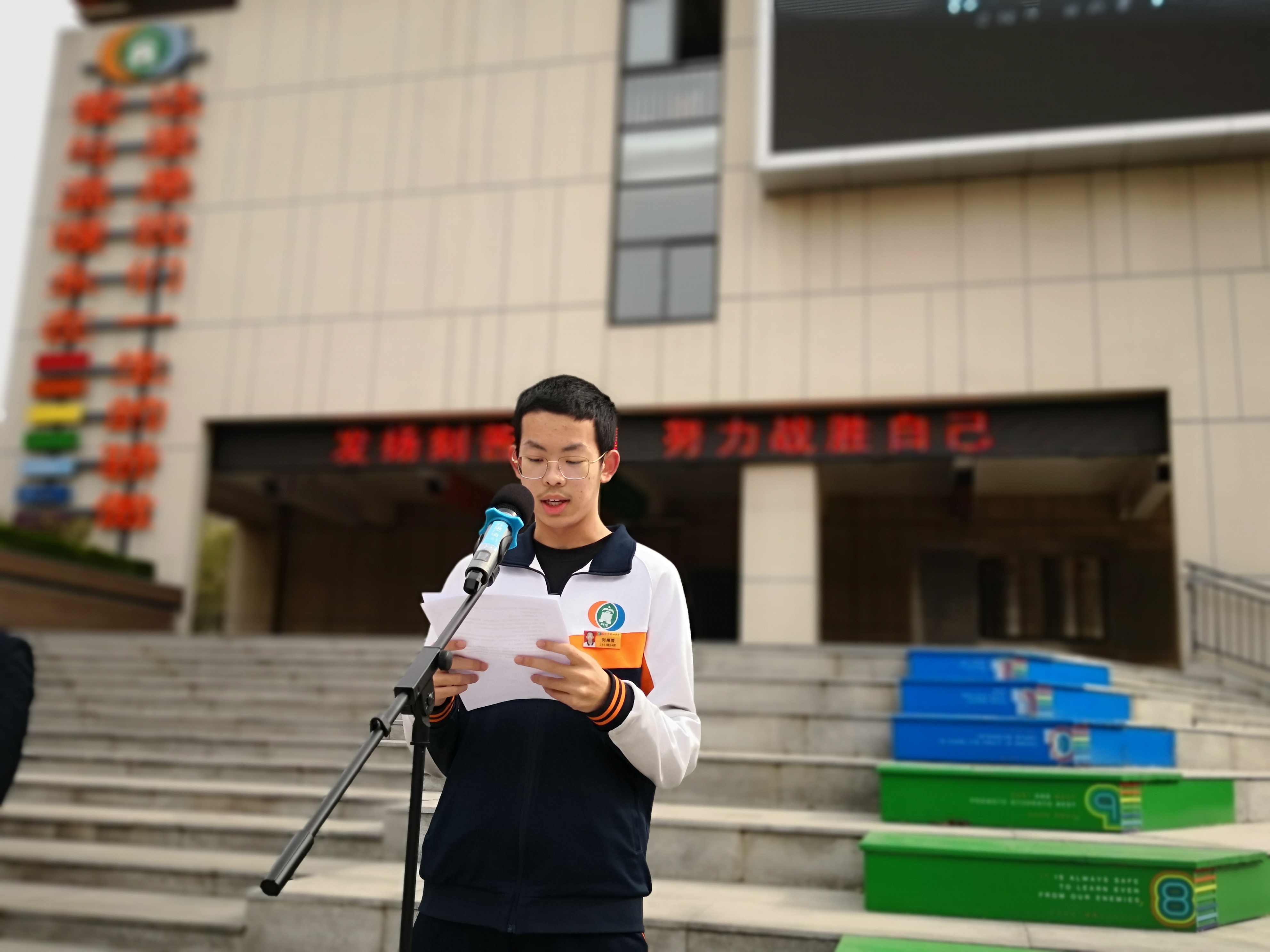 高二38班刘绵哲同学代表高二全体同学做了发言。刘绵哲同学在刚刚过去的月考中取得第一名的好成绩,同时是化学竞赛一等奖的获得者。他从三个方面提出倡议:学思结合、提高效率,做好规划、自主安排,锻炼身体、保证休息。刘绵哲同学勉励同学们要咬定目标不放松,坚定信心不动摇,以更加昂扬的豪迈斗志、更为刻苦的拼搏精神、更富成效的卓越行动,向着前路奋力冲锋,用热血的青春、滚烫的生命去追逐心中梦想,全力以赴,再攀高峰。