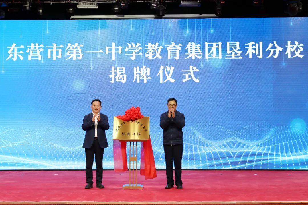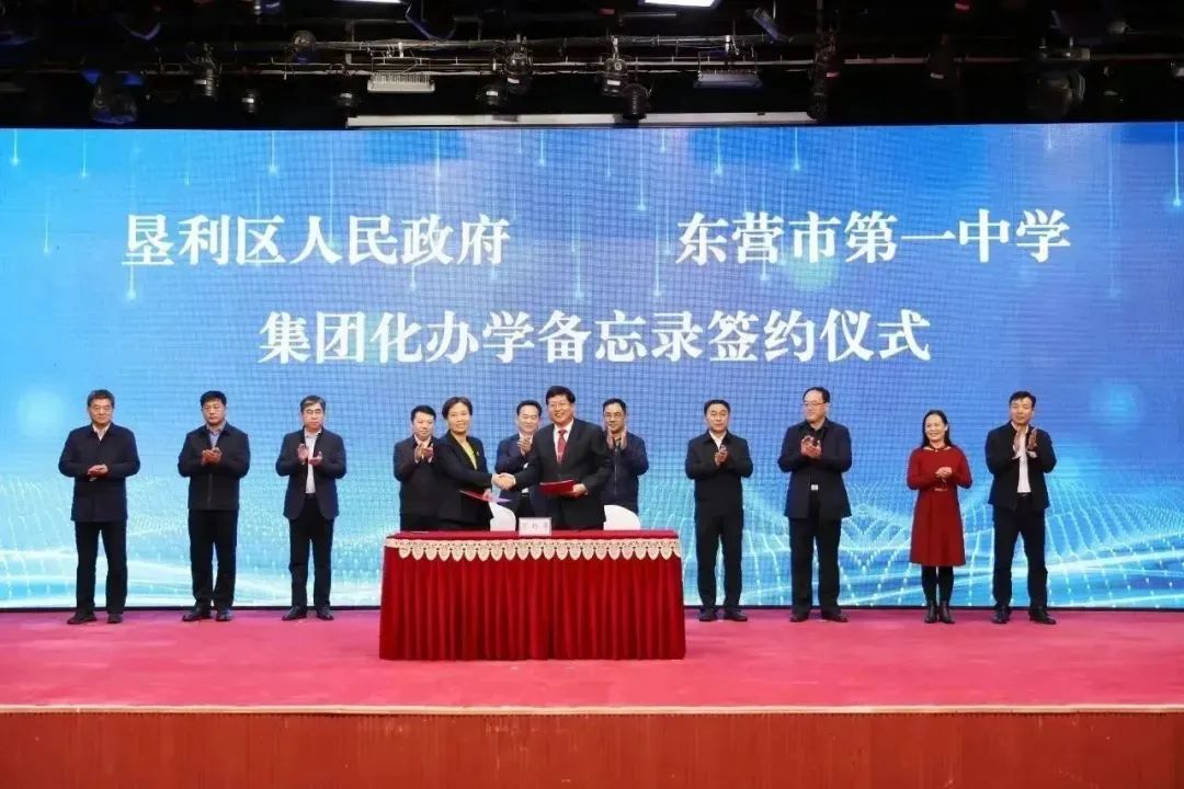 垦利区委常委、副区长张素霞与东营市第一中学校长史本泉签订了垦利区人民政府与东营市第一中学集团化办学备忘录。东营市教育局党组书记、局长董玉奎与垦利区委书记西牧山为东营市第一中学教育集团垦利分校揭牌。