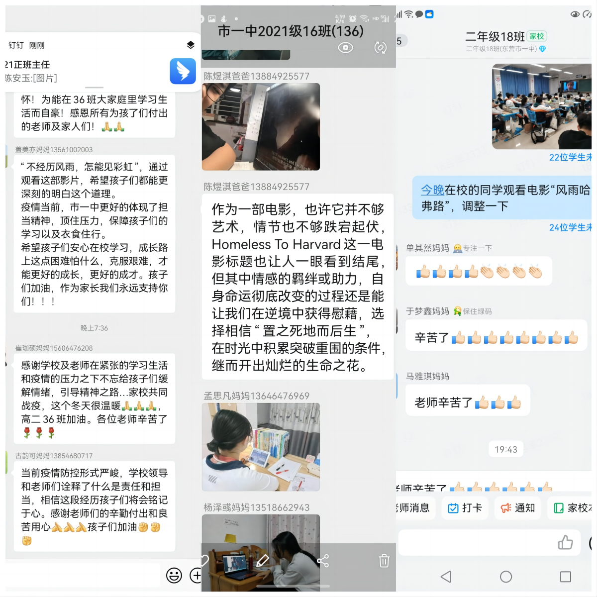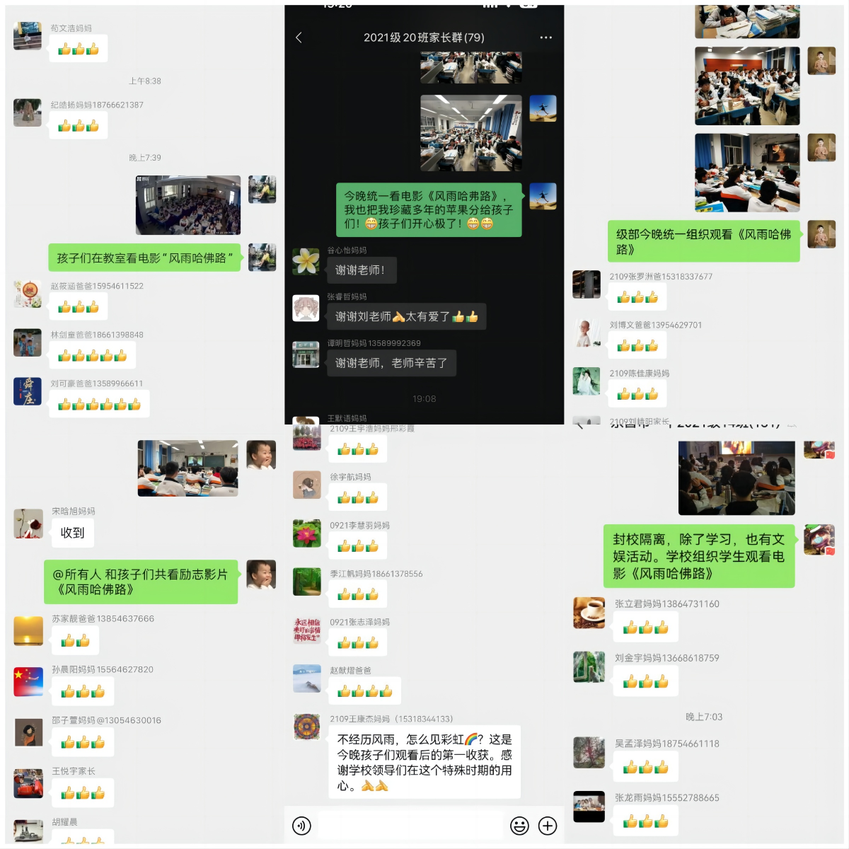 孩子们在校观影的活动在家长群里引起了很大的反响。家长们在群里畅所欲言,表达市一中领导和老师们的感谢之情。“疫情无情,人间有爱,感恩市一中的领导和老师们在寒冷的冬天让孩子们感受到前进的动力”;“非常感谢学校在孩子们最需要鼓励的时候安排观看,相信孩子们通过观看这部励志影片,会有所感悟,有所触动”;“感谢学校的担当,感谢老师们的付出,相信孩子们在经历风雨之后,会更懂感恩,努力前行,不负韶华不负梦想”……一条条留言不断在家长群刷屏,家长们以热忱的话语,表达着对孩子们深深的期望。