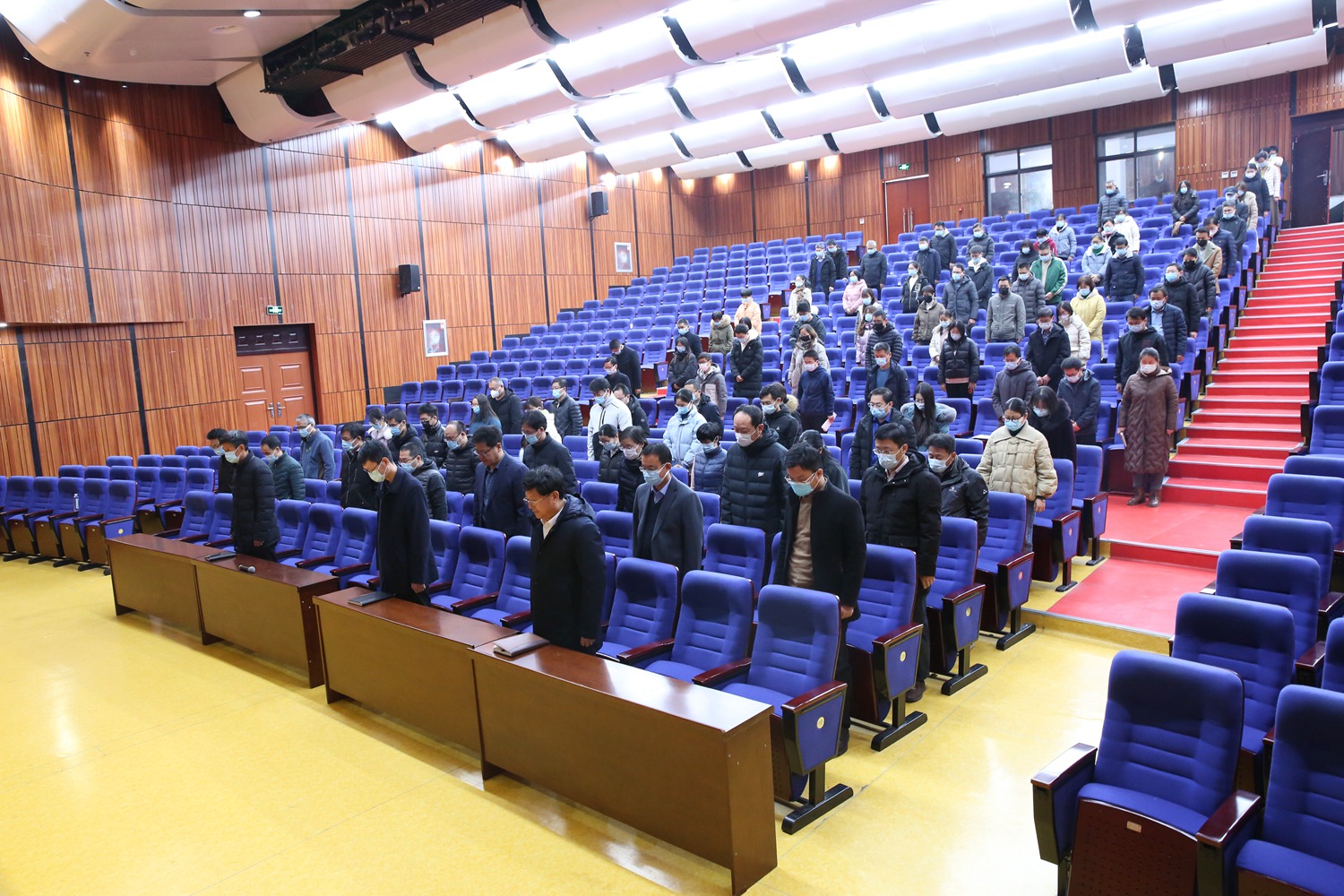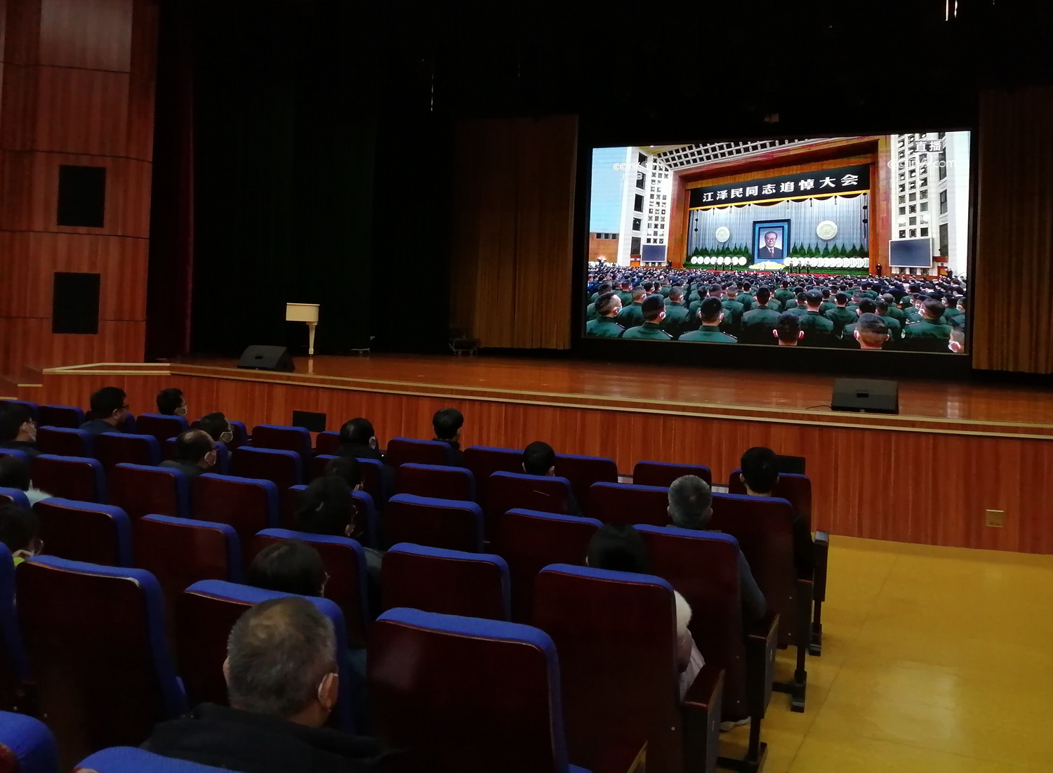 我校中层以上领导干部和部分职工在报告厅收看直播,与全党全军全国各族人民一道沉痛地悼念敬爱的江泽民同志,深切缅怀江泽民同志的丰功伟绩和崇高风范,寄托哀思。