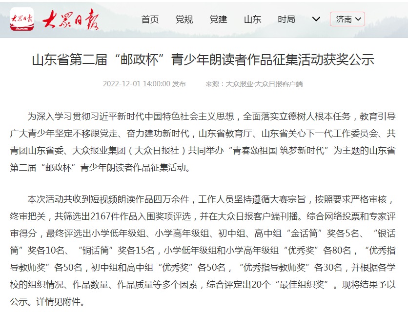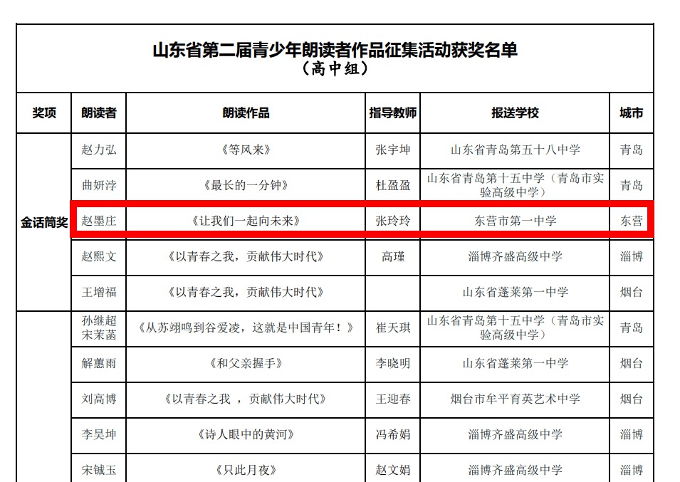 近日,山东省第二届青少年朗读者作品征集活动圆满结束,市一中2022级高一7班赵墨庄同学从来自全省各地的众多选手中脱颖而出,喜获金话筒奖(最高奖项,全省仅有5人),教师张玲玲荣获优秀指导教师奖。