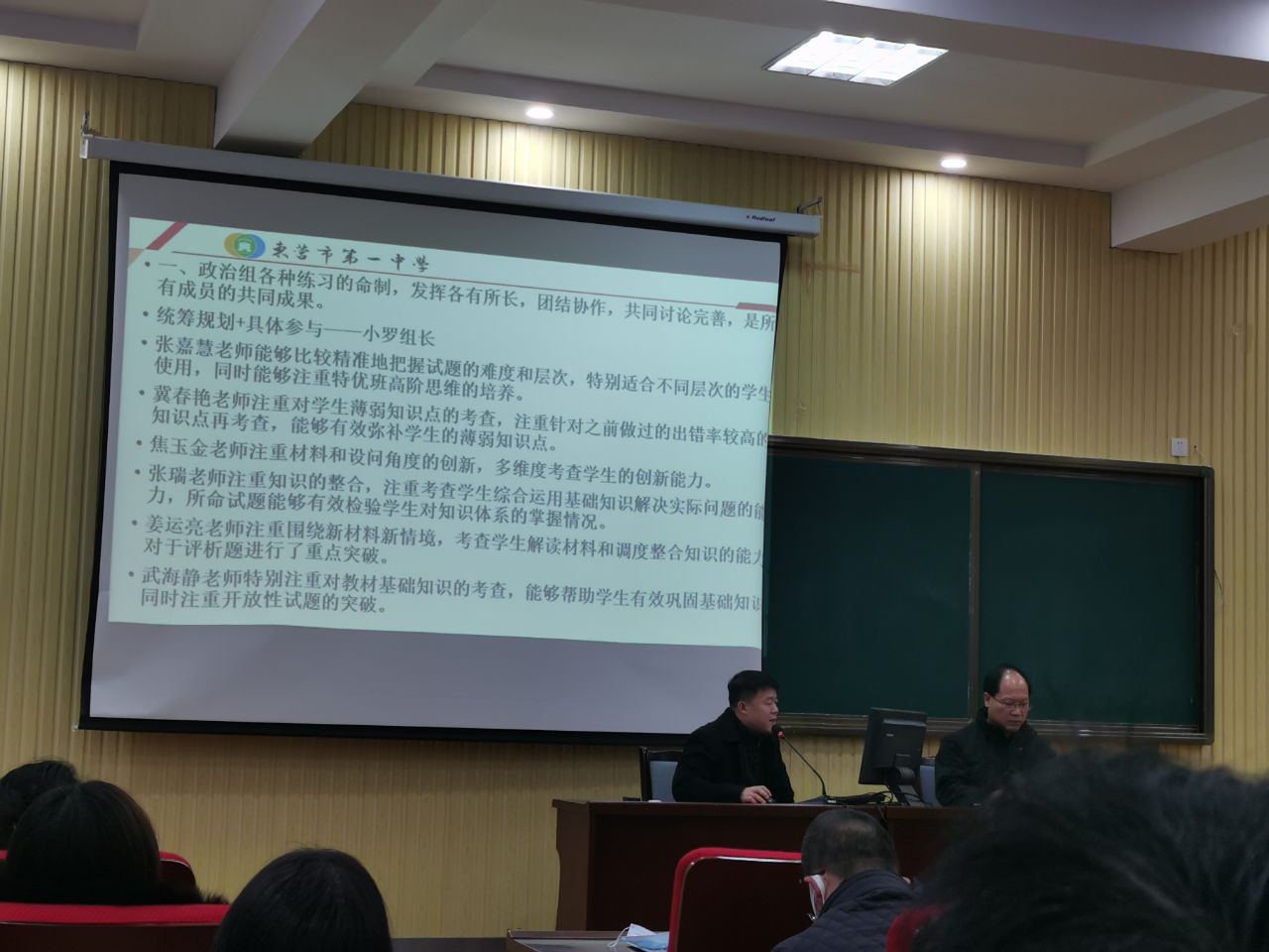 政治组苑忠国老师介绍了试卷命制的全过程及环节意图。他认为试题命制应做好以下几点:一是发挥《新课程标准》《中国高考评价体系说明》的指向作用,找准命题大方向;二是要确定好自习练的范围、试题结构、试题难易比例等;三是组内成员发挥所长,团结协作,共同讨论完善试题。苑老师从命题的环节出发,分享了试题命制过程以及应注意的细节,同时鼓励教师们多尝试命题,在命题中不断提升自身能力,让试题命制成为专业成长的助力。