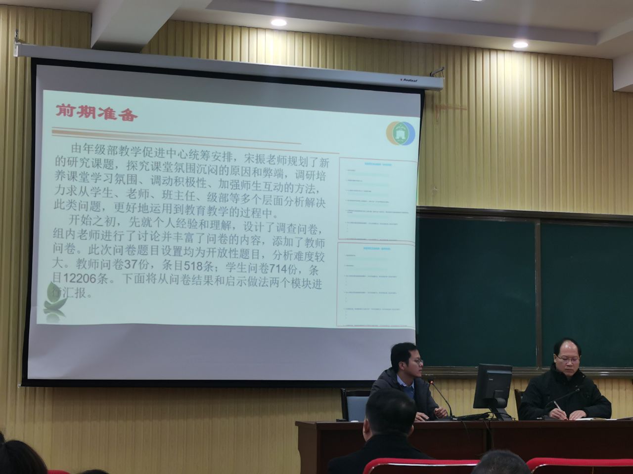知行班宋晓帅老师就微课题“课堂师生互动”做了调研汇报。分别从教师、学生两方面展开问卷调查,分角度总结了课堂沉闷的原因、改进措施及启示。宋老师重点谈到兴趣是最好的老师,鼓励是对学生自信心的浇灌,每一份关爱和鼓舞都会成为孩子人生道路上沿途盛开的鲜花。