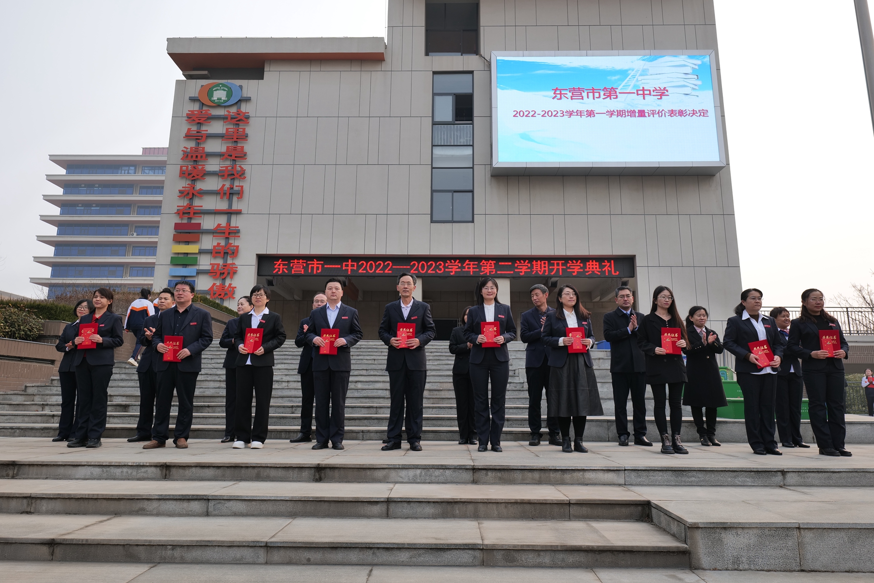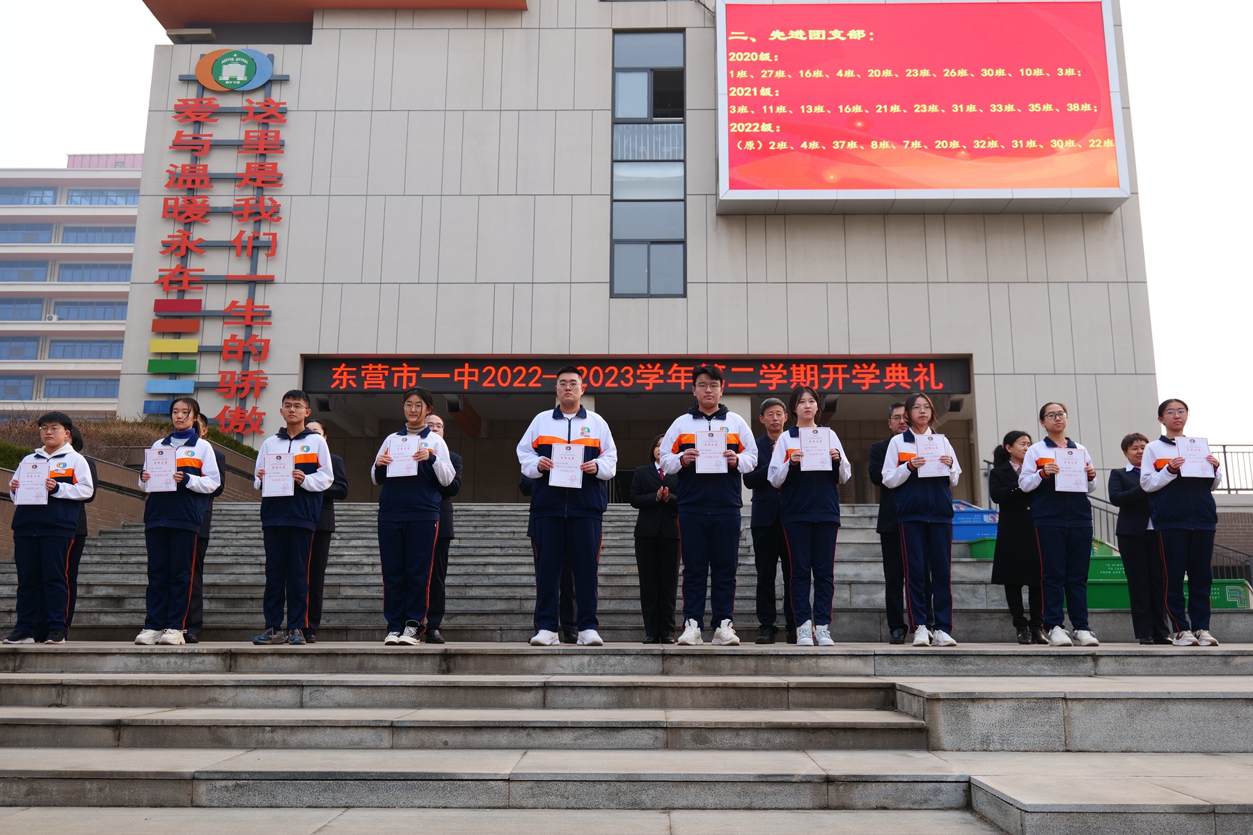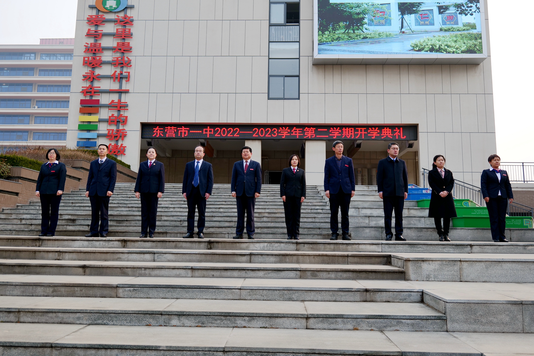 冉冉升起的五星红旗下,激昂雄壮的国歌声中,东营市第一中学2022—2023学年第二学期开学典礼拉开序幕。