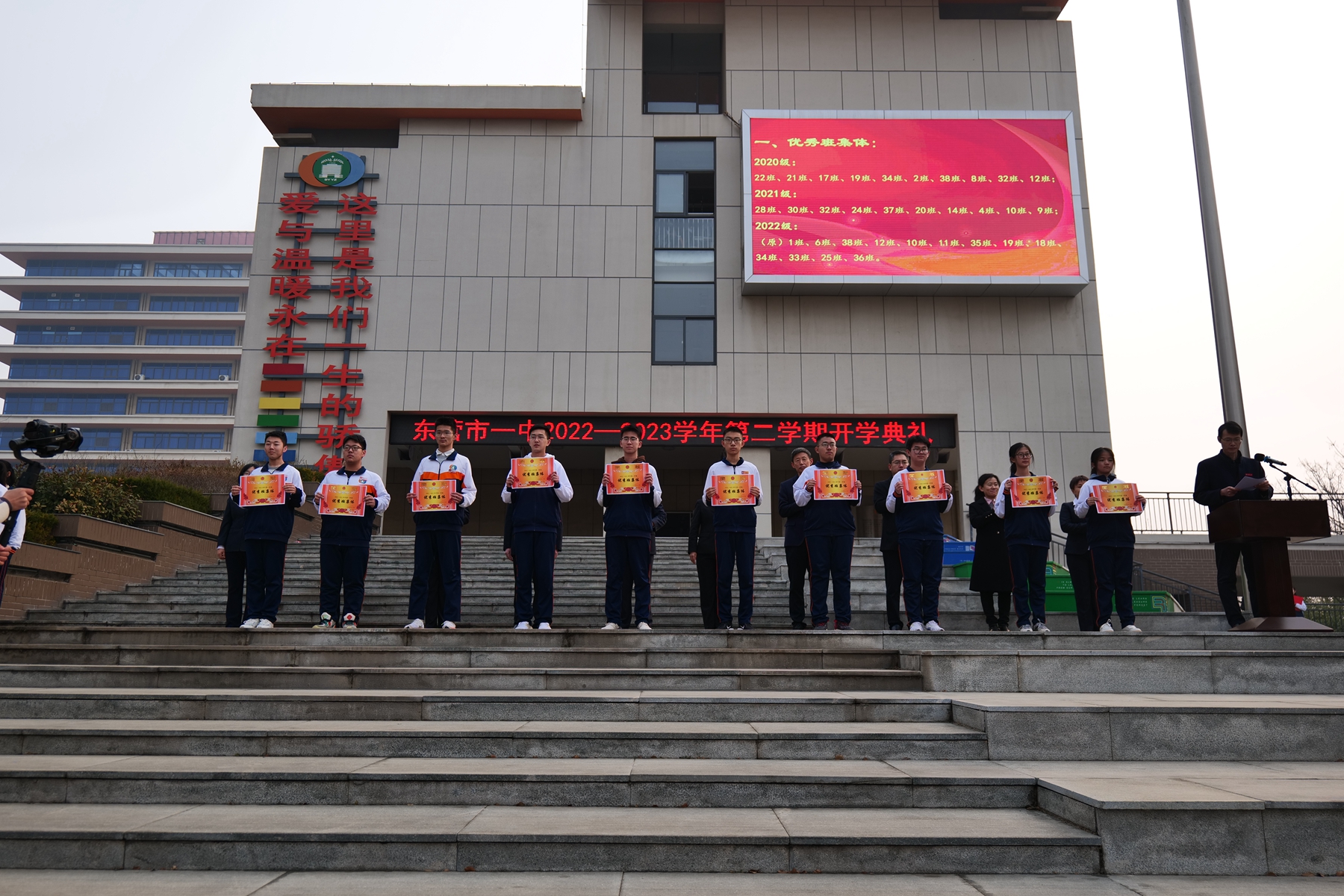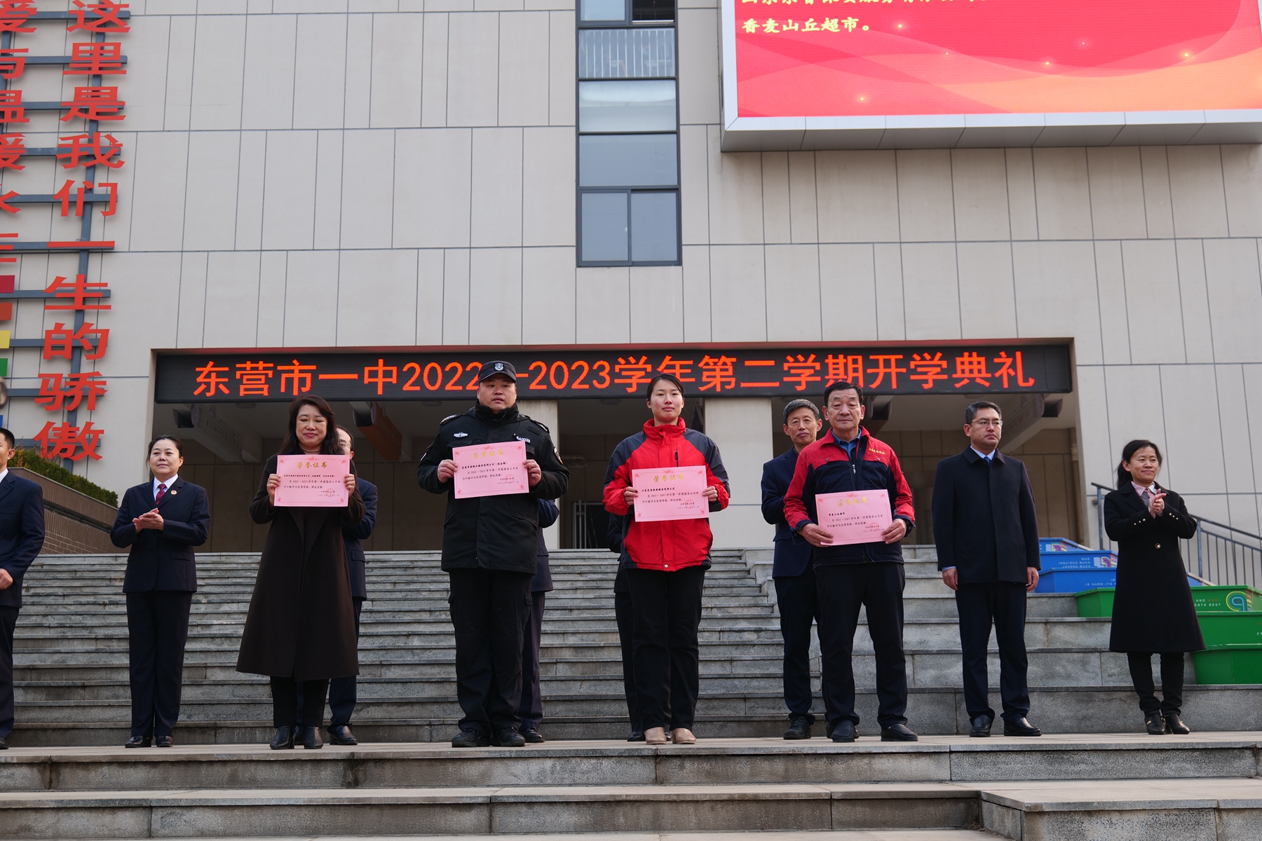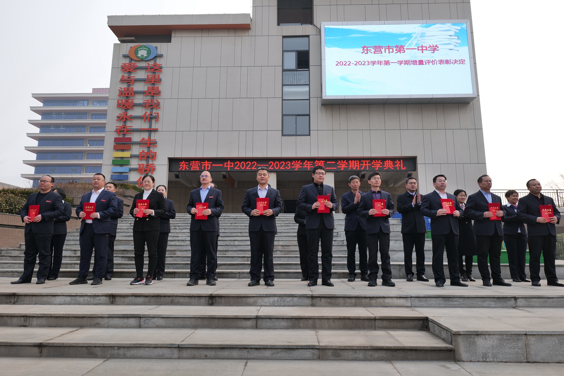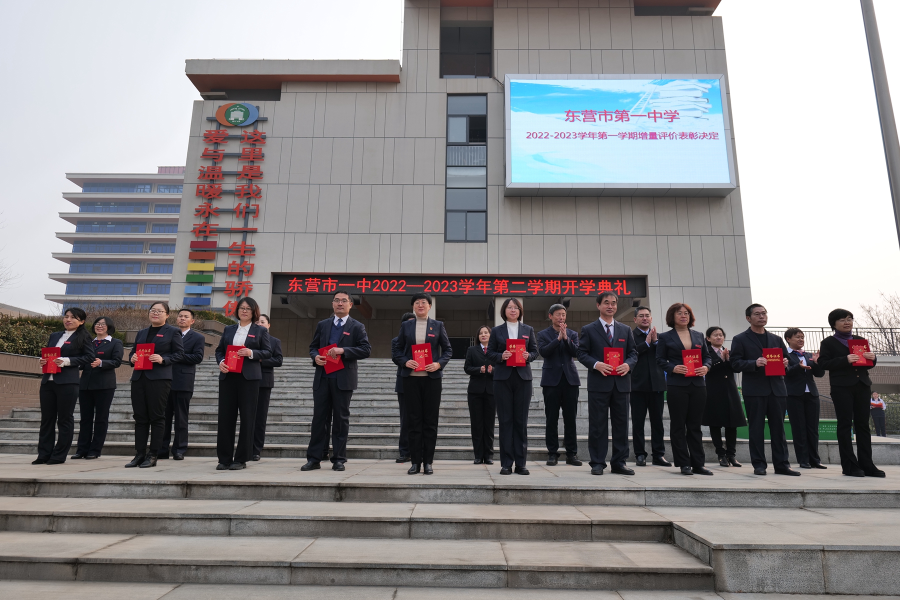 冉冉升起的五星红旗下,激昂雄壮的国歌声中,东营市第一中学2022—2023学年第二学期开学典礼拉开序幕。