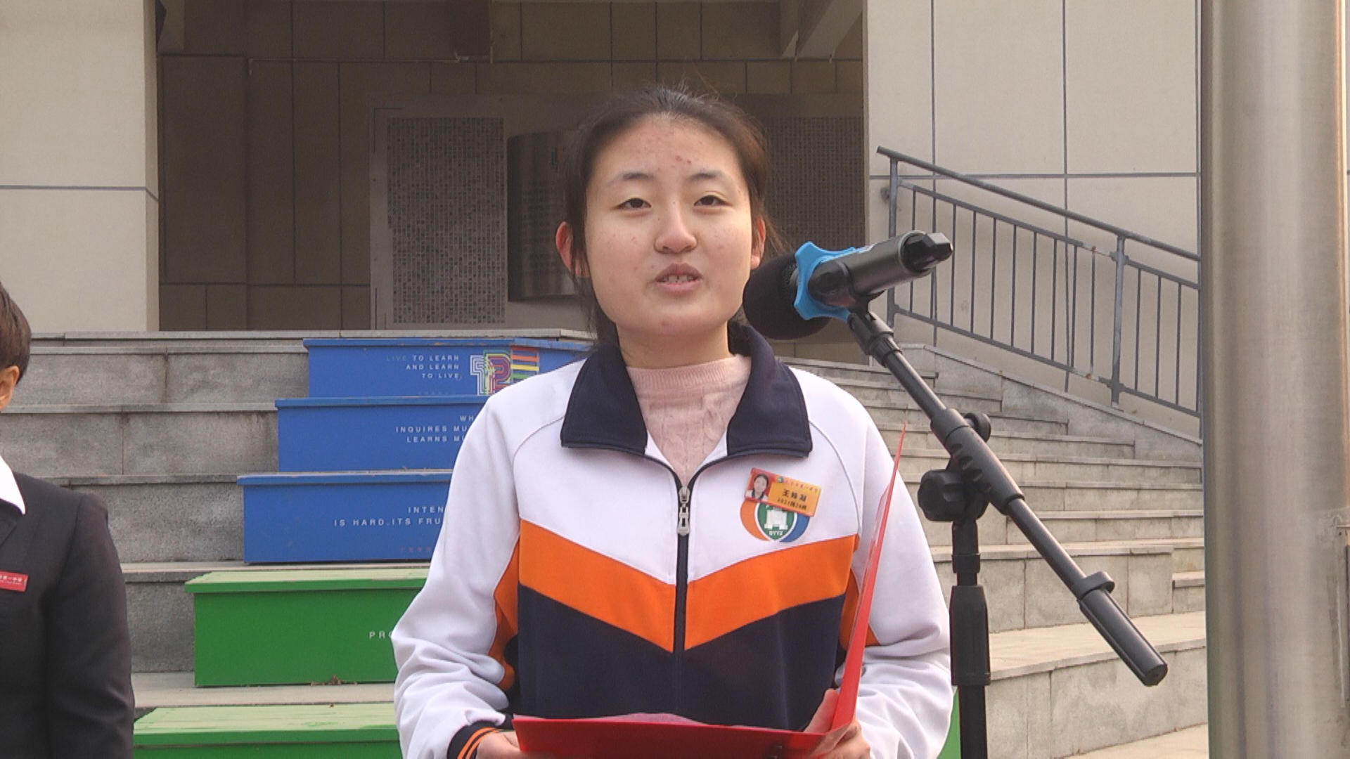 学生代表、2021级28班王姝凝激情发言,呼吁同学们带着自信与豪情,求知求学,坚韧不拔,一起向未来!