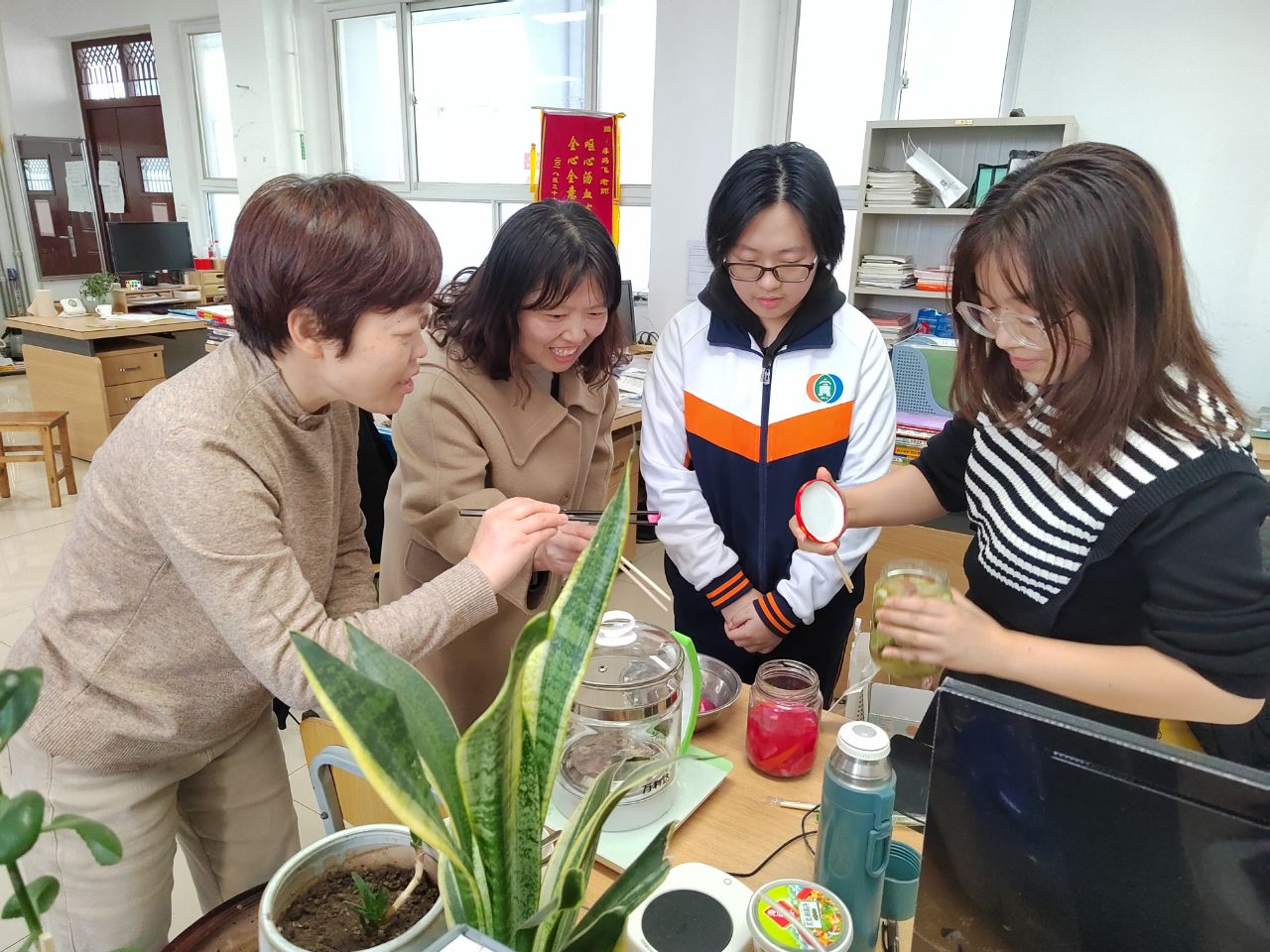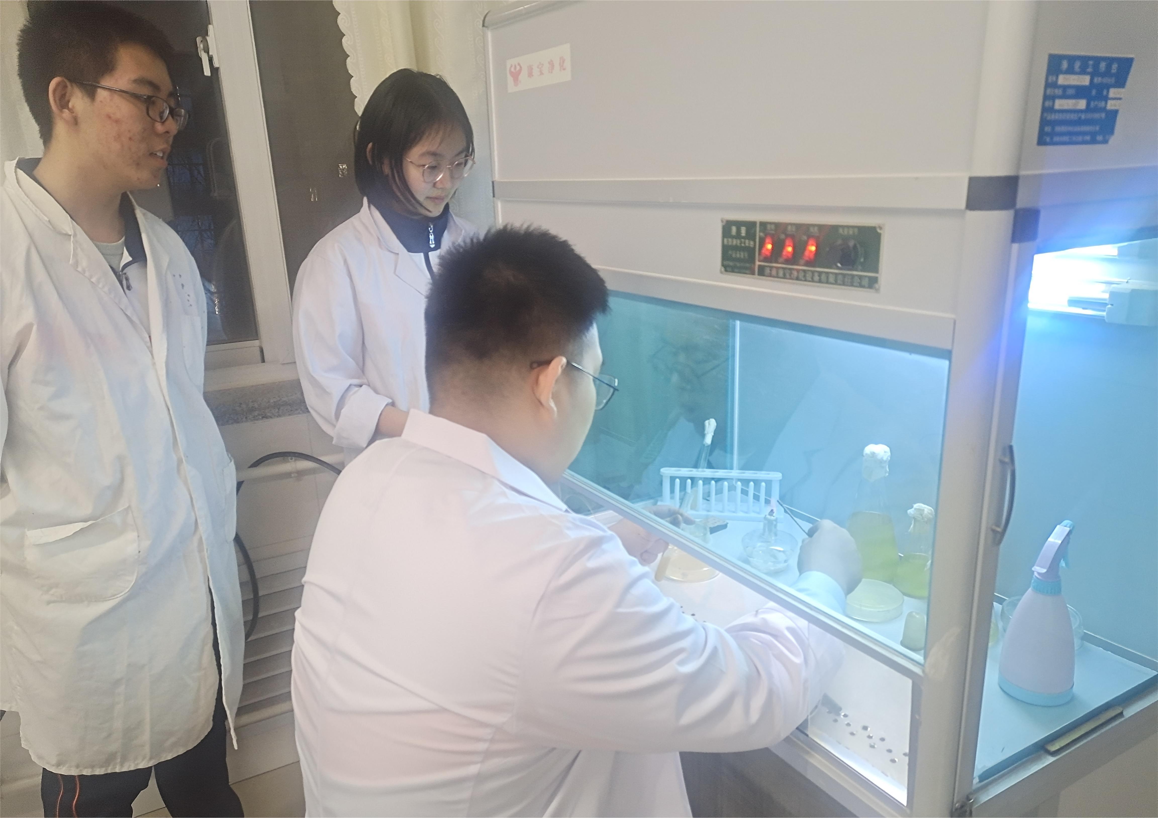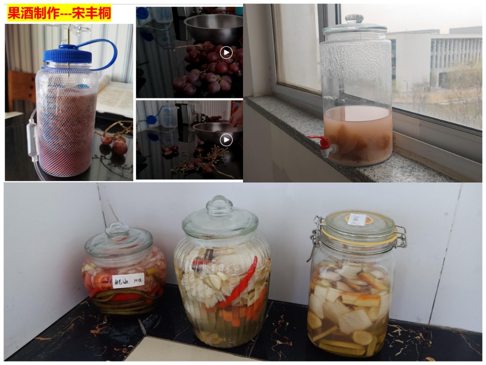 制作过程前,老师们讲解了生物发酵的知识原理,然后让学生们结合所学,准备素材,动手实践:酿果酒,首先把水果简单冲洗干净,榨成汁,倒入发酵瓶中,利用水果中自带的野生酵母菌进行无氧发酵;制泡菜,是把蔬菜腌渍起来,主要利用乳酸菌的无氧呼吸作用产生乳酸进行泡菜的制作。实践活动,极大地激发了学生对生物学的兴趣,纷纷到生物实验室进行微生物培养基的制备、微生物的筛选、分离等操作实践。