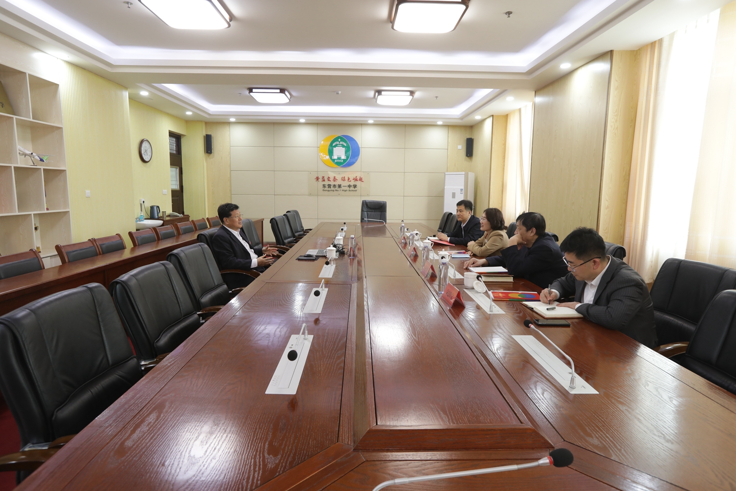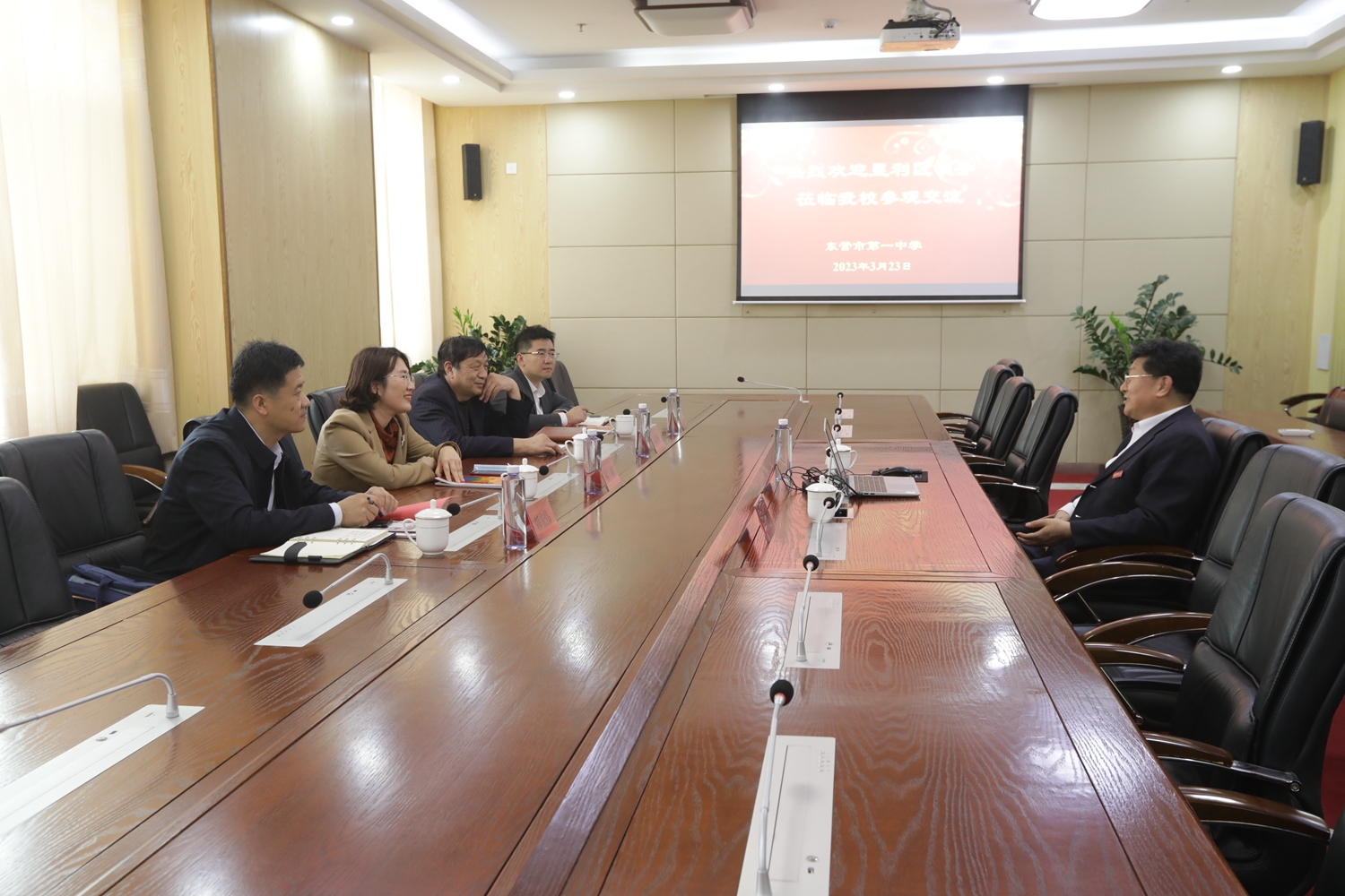 市一中党委书记、校长史本泉在会议室热情接待了垦利区来访领导,双方就教育教学管理、校园文化建设等有关内容进行了交流。