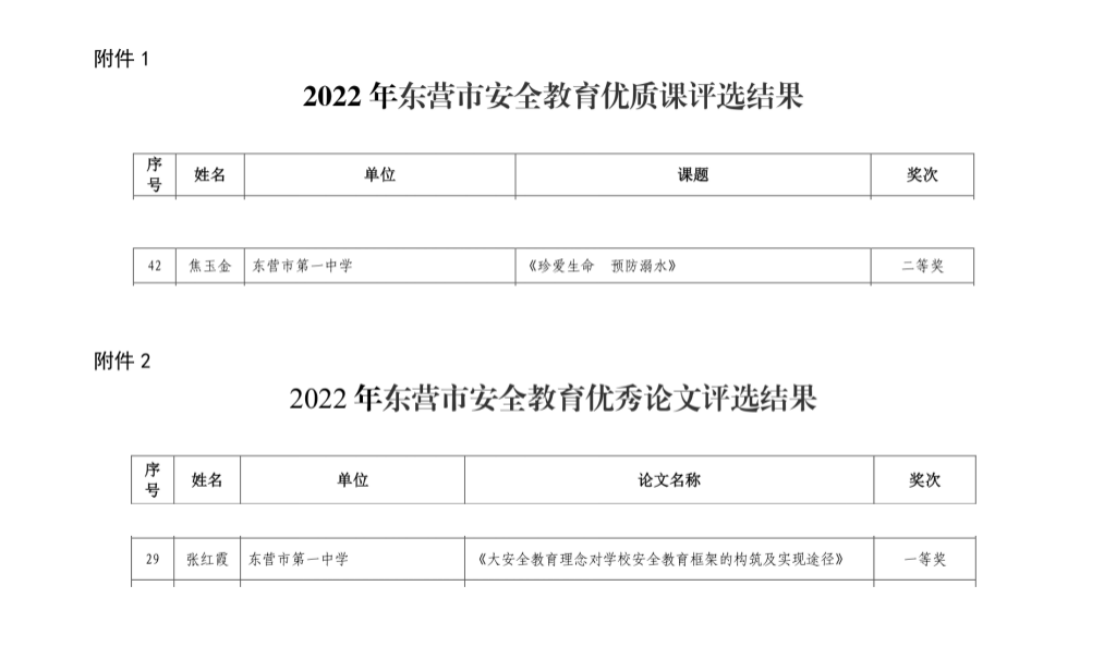 二、根据《关于开展 2022 年教学教研系列评定工作的通知》(东教字〔2022〕37 号)要求,我校组织开展了安全教育优质课和安全教育优秀论文评选活动,活动评选推荐的课程论文参加市级评选均获奖。焦玉金老师的《珍爱生命 预防溺水》 获得市安全教育优质课二等奖,张红霞老师的《大安全教育理念对学校安全教育框架的构筑及实现途径》获得市安全教育优秀论文一等奖。