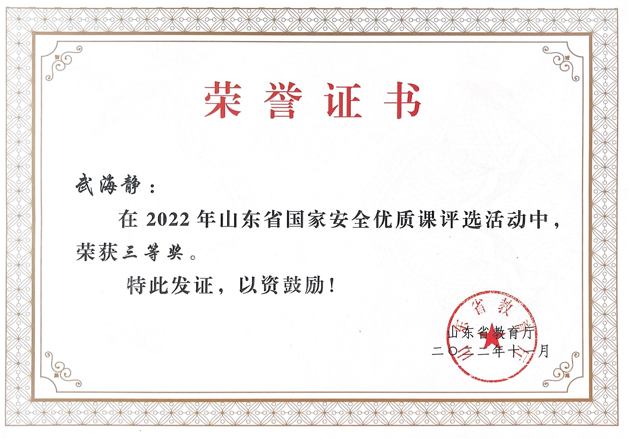 三、在山东省教育厅组织的国家安全教育优质课评选活动中,我校武海静老师的《积微光成炬,让中国光芒万丈》荣获省三等奖。