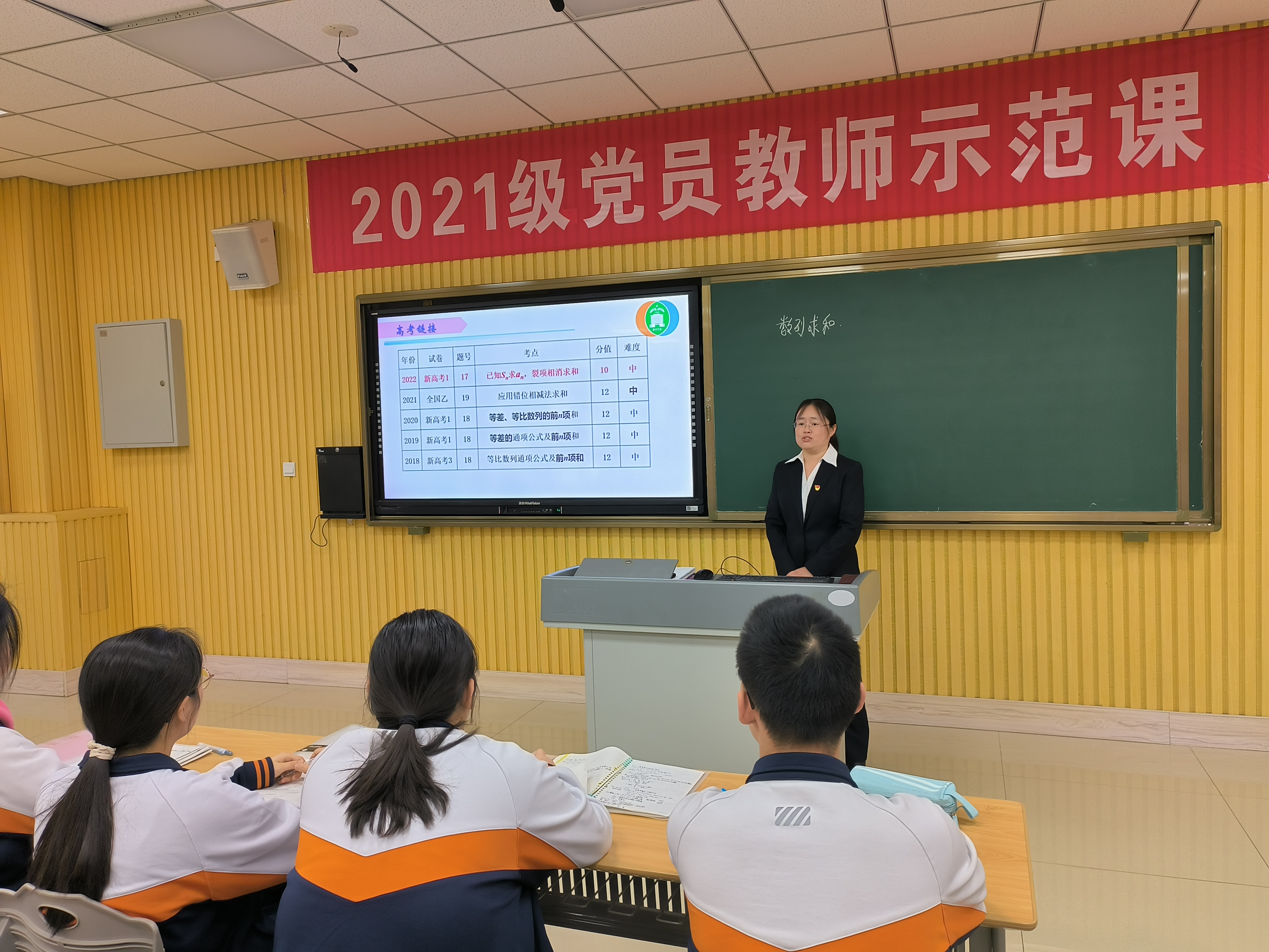 作为数学组的两位党员教师,黄琰老师和马金玲老师在教学中努力立足于新课标的精神,根据高二学生思维特点,由浅入深的介绍了数列分组求和、奇偶并向求和、裂项相消法求和。黄琰老师温文尔雅话术简洁,设计主题鲜明,思路清晰;马金玲老师巾帼不让须眉,慷慨激昂,燃爆课堂。两位老师把握课堂节奏,各环节紧扣,层层推进。教法上,采用“启发—探究—讨论—归纳—应用”式教学模式,充分发挥教师的主导作用展示了扎实的教学功底和突出的教学能力,充分发挥了党员模范示范作用。